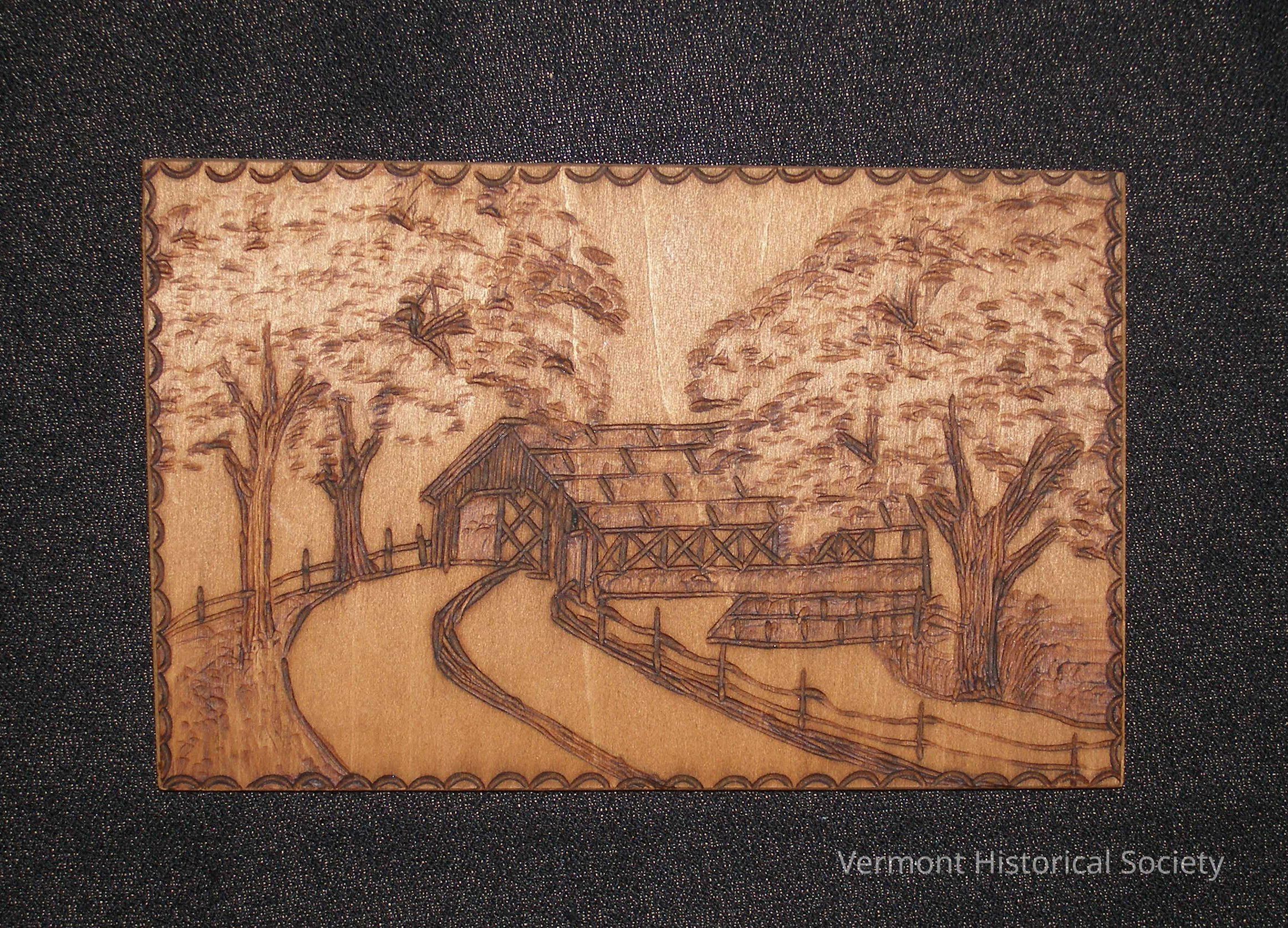 Wood-burned postcard with a scene of a covered bridge and trees, and a scalloped edge. On obverse, also wood burned, "Post Card" in script at top, a line burned down center to separate address from greeting, and on left side, in script: "Greetings/ from/ Vermont" In one corner, written in pencil: "3 (cent) / stamp" Also on obverse, remnant of a grey plastic hanger.Acquisition