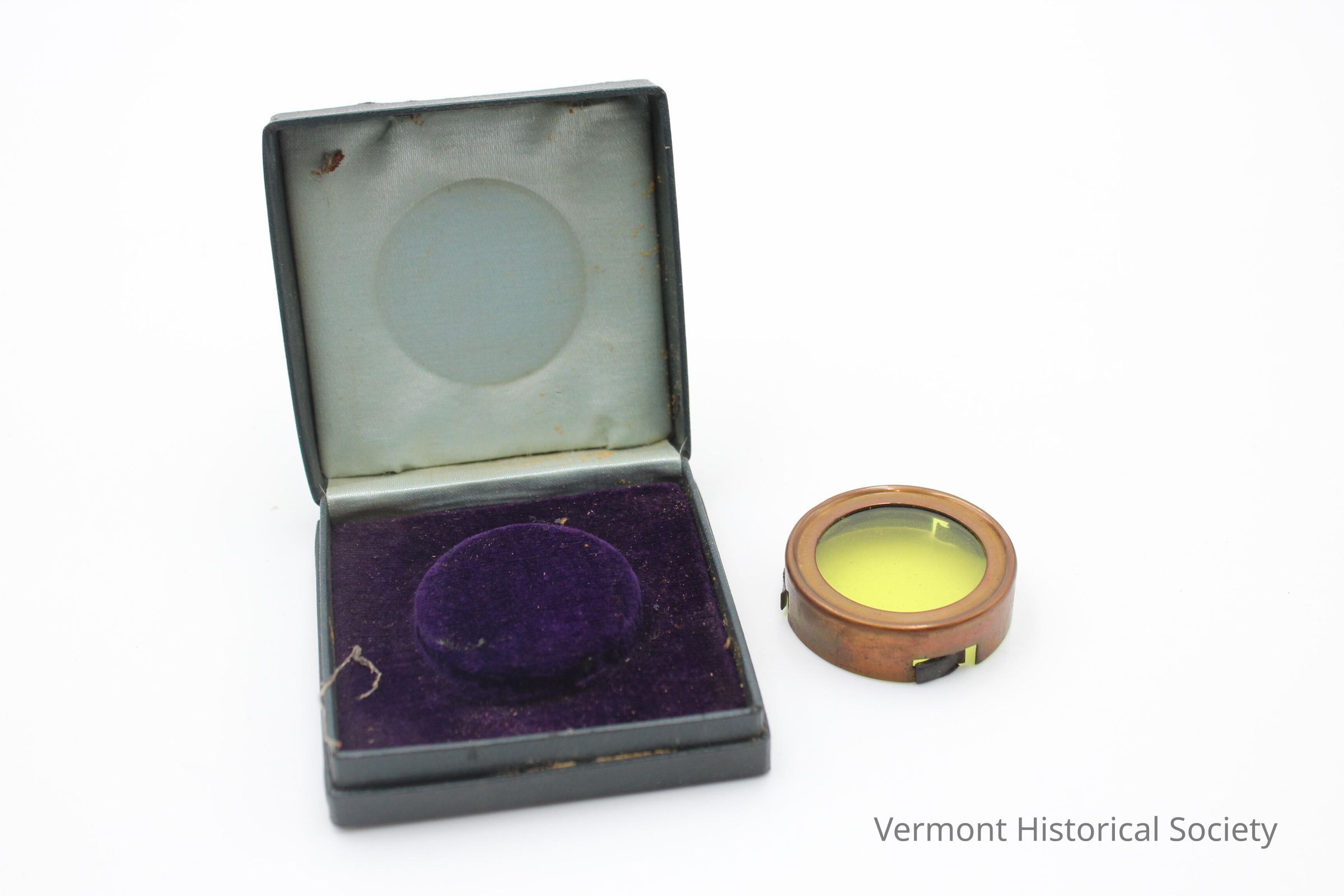Circular yellow filter with green leather case. The filter consists of a round pieces of yellow glass set into a copper frame. The back is finished with a glossy black substance. Three indentations are placed equidistant around the frame to secure the filter onto a camera lens.
