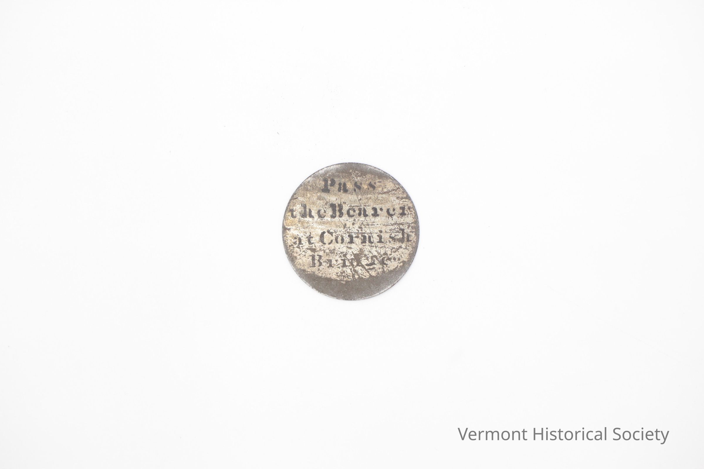 Round medal token stenciled on one side with the inscription, "Pass the Bearer at Cornish Bridge"Context