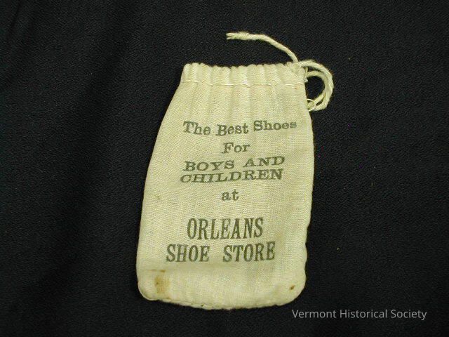 Small cotton drawstring bag. The top of the bag has an undecorated drawstring. The body is a rectangular shape with rounded edges and shows some discoloration from age. The center of the front panel has “The Best Shoes / For / BOYS AND / CHILDREN / at / ORLEANS / SHOES STORE” printed in black lettering.Context