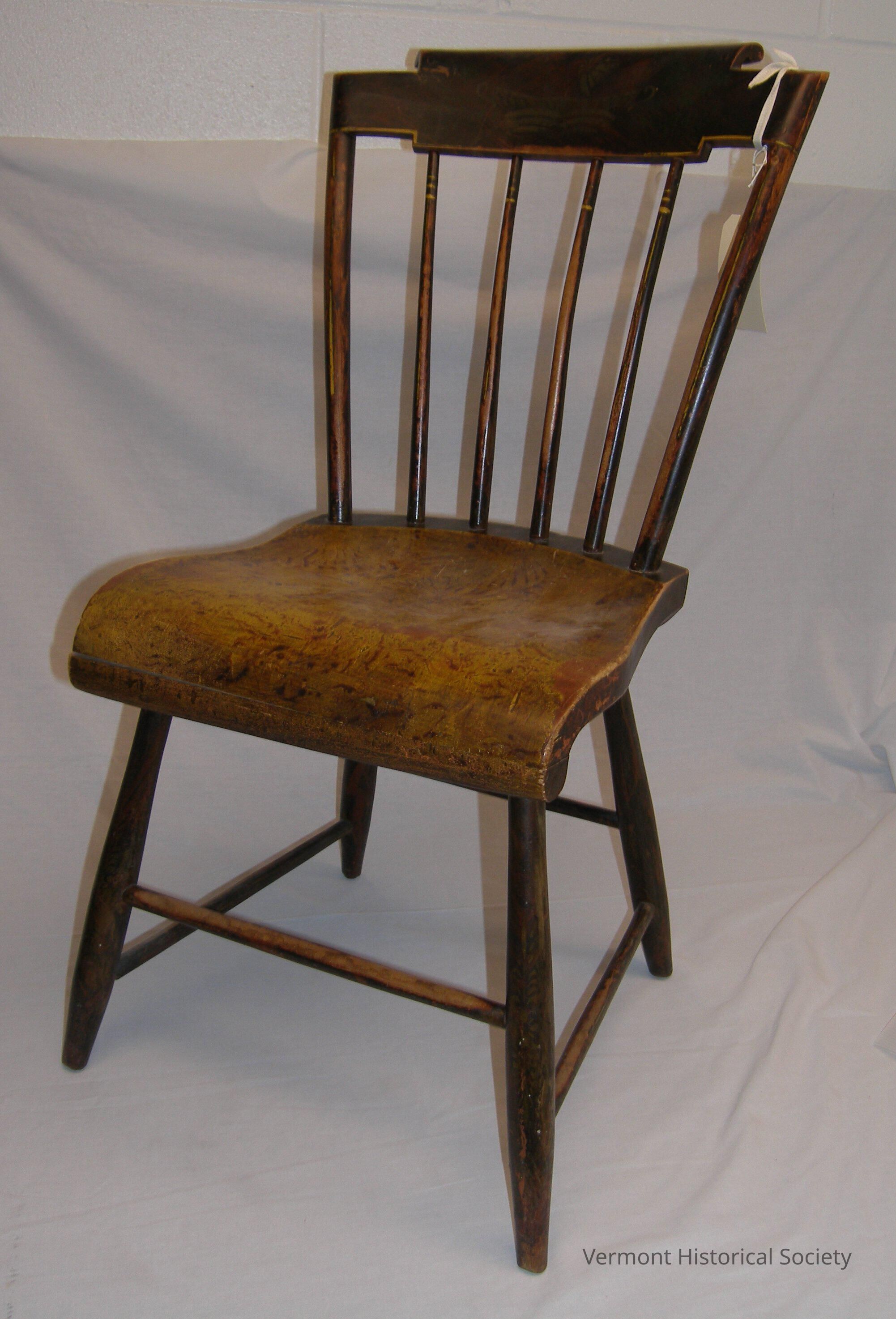 Yellow grain painted windsor chair with a scrolled seat. The crest rail is stenciled with a fruit basket design (now faded). The chair is sponge painted in imitation of curly maple.