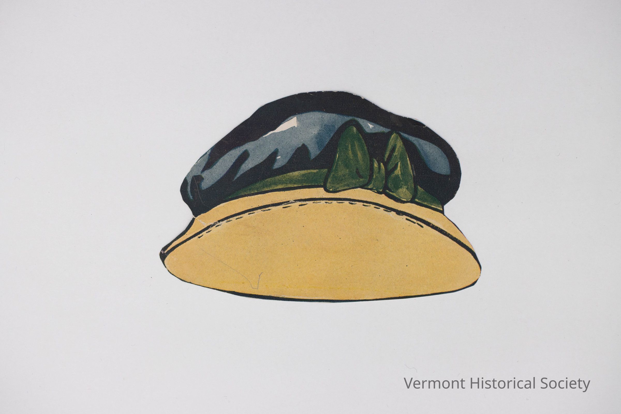 Yellow and black printed paper hat for a paper doll. It has a flat crown, and the brim is downturned. The back shows a portion of a sales catalog page.Context