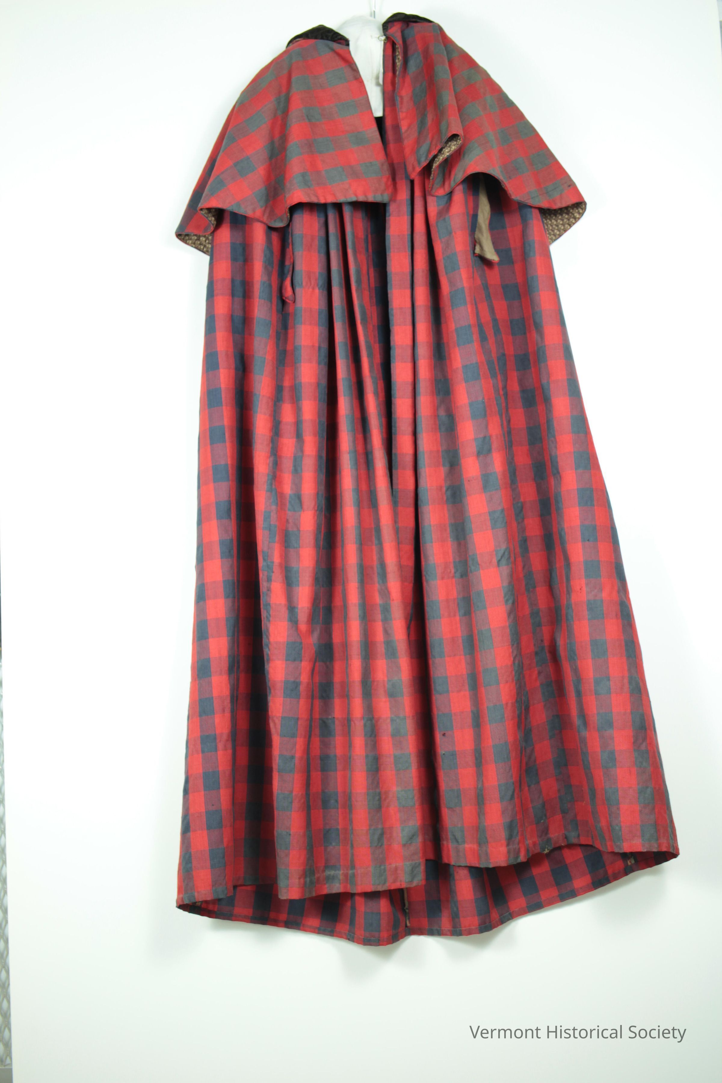 Red and blue plaid wool cloak. The material of the cloak is heavily gathered at the neckline. The neckline in faced in green wool, and there is a loop for hanging. A small over-cape falls from the neck to cover the shoulders that is lined in maroon and cream printed cotton. There is a black velvet collar lined with red, blue and yellow plaid. The neck closes with a hook and eye (hook missing). The side seams have openings for arms that are faced in green wool.Context