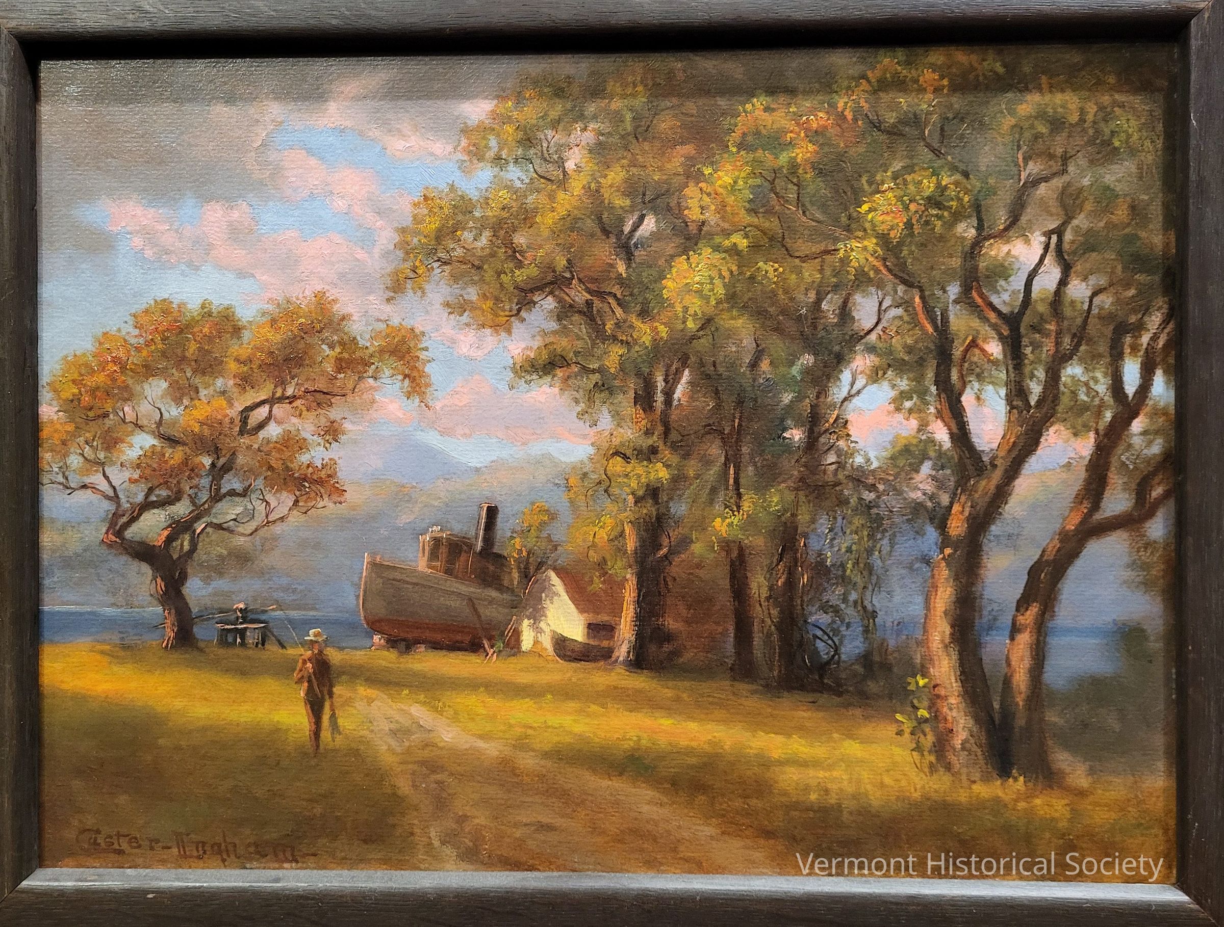 Landscape image of dirt lane, trees, water and a mountain backdrop. A child is depicted in the foreground with a fishing pole and brace of fish. A small, white building with brown roof is in the middle ground. A small dory or other such watercraft is in front of the building. A large steam-powered vessel sits on blocks, partially obscured by the building. The boat has a fairly large hull with red and white paint. A small pilot house sits forward of a steam engine and black funnel. A wooden, hand-operated winch or windlass is located on the ground near the bow of the steamboat. The painting is signed in the lower left by artist Custer Ingham. Painted on board, the back of the work has the artist's name in pencil as well as the date 1916.Type of Painting