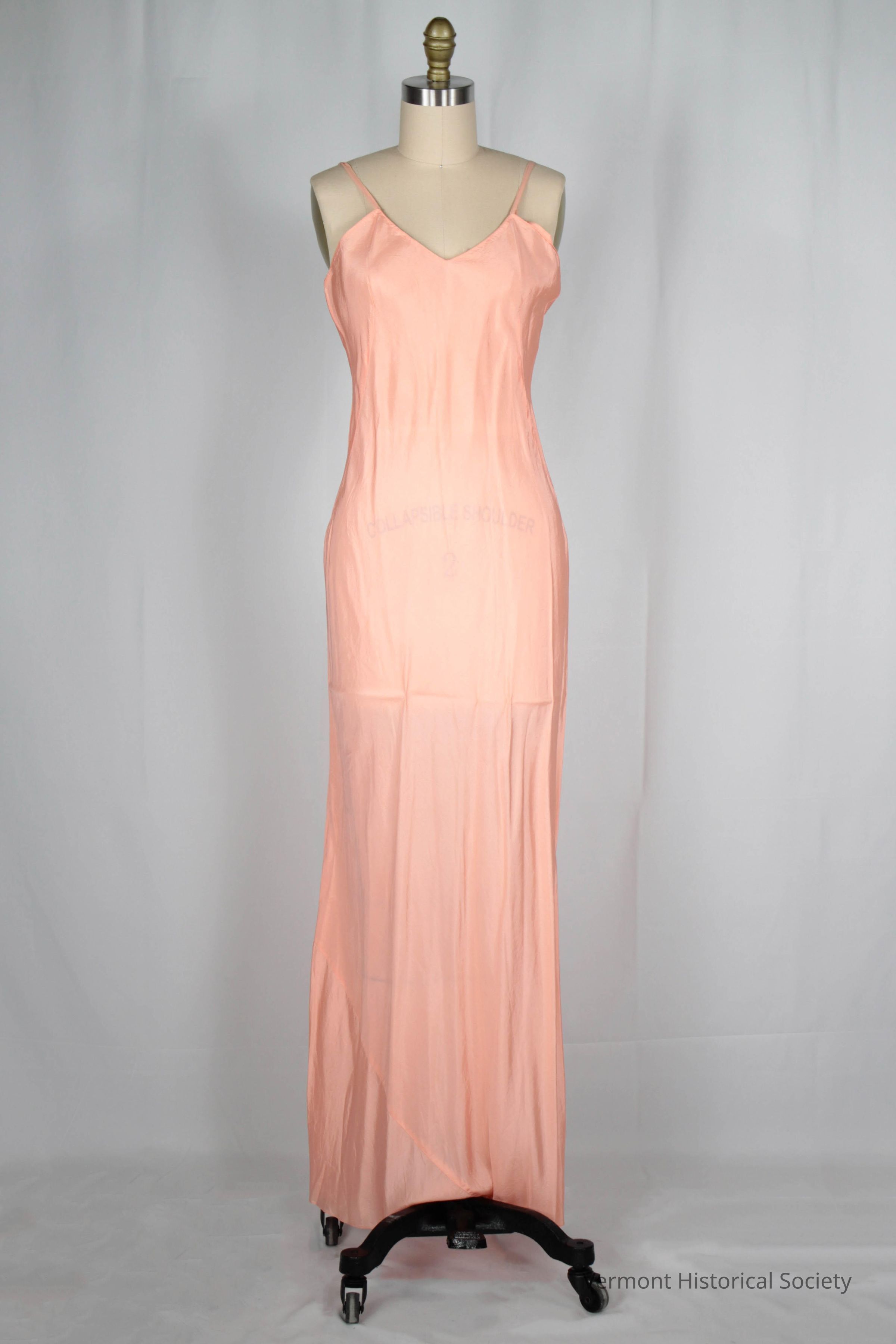 Floor-length pink silk slip. The top of the slip is held on the shoulders with narrow straps, and the body is bias cut. The garment fits close to the body with a slight flare toward the hem.