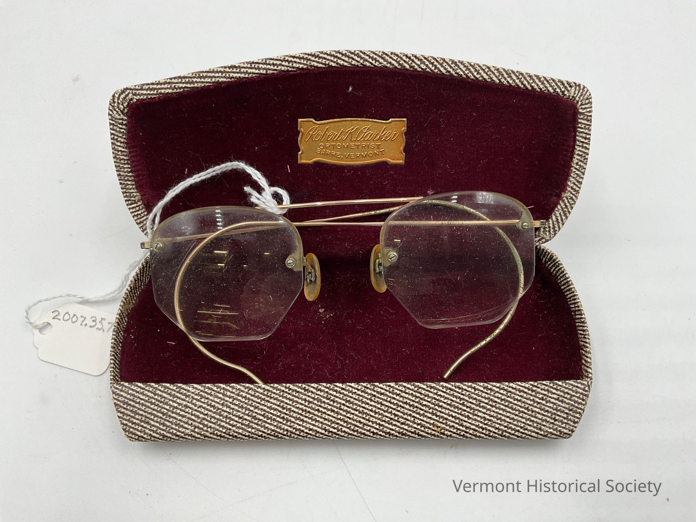 A pair of bifocal glasses with wire rims and arms, plus a hard black and white case with plush purple inside. The glasses were sold by Robert K. Parker, optometrist in Barre, Vt.Context
