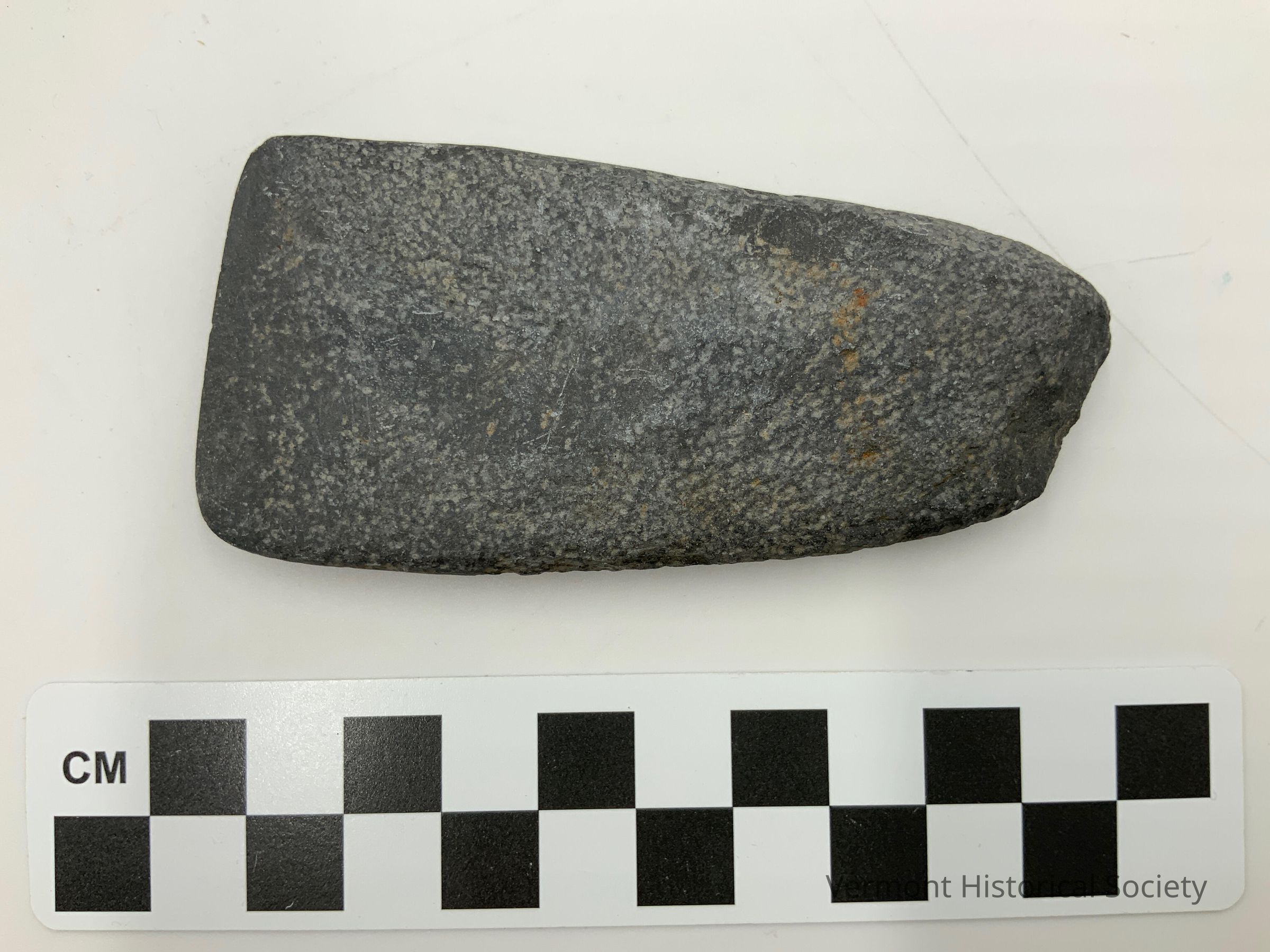 Ground stone gouge made of hornfels. The surface is pecked. One side is ground. The blade end is polished, and the blade is curved.Context