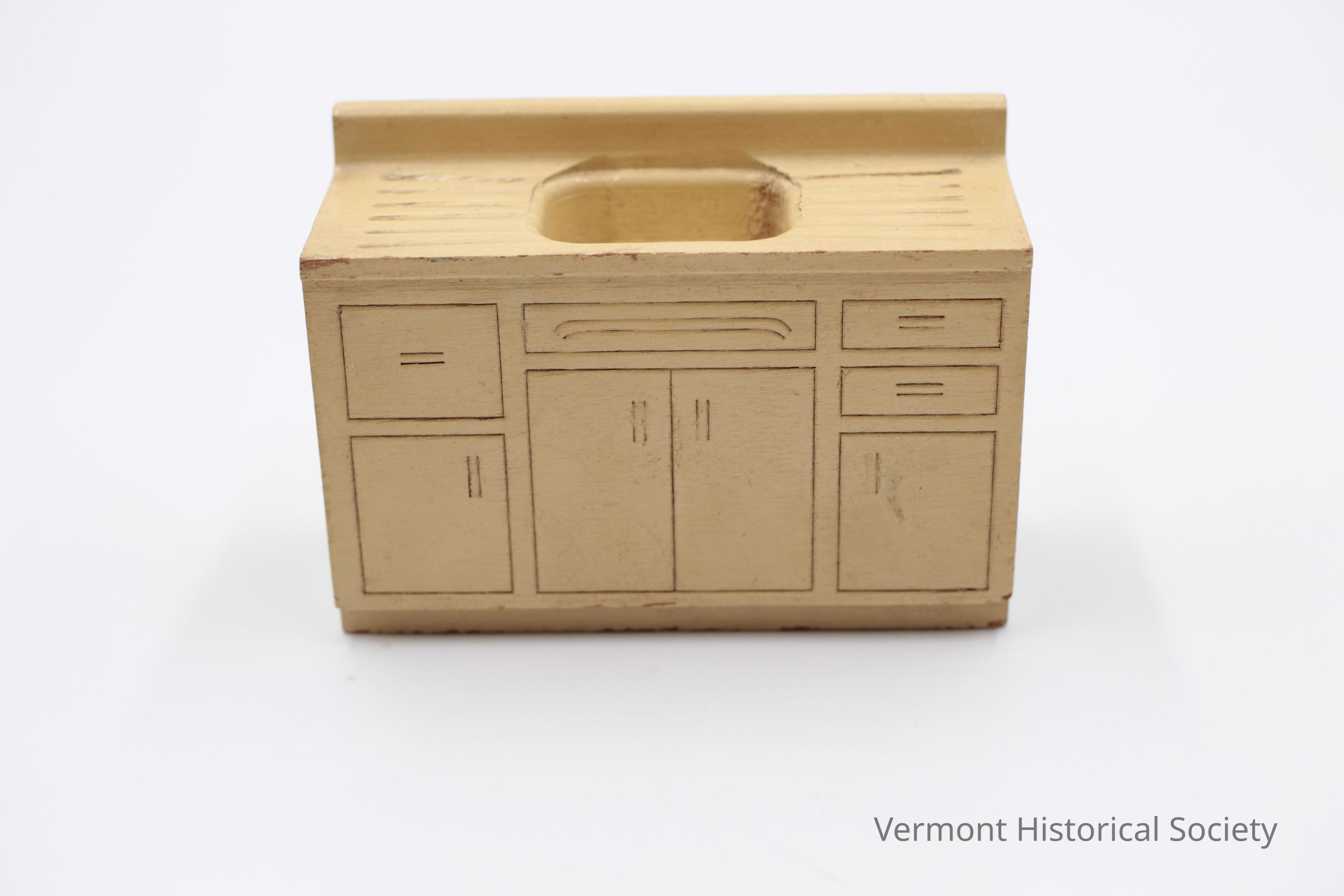 Miniature wooden kitchen silk and bottom cabinets sized for a dollhouse. The top is carved with a rectangular sink at the center, flanked by parallel lines (imitating a drying rack.). The front is carved with four cabinet doors and four drawers. The whole is painted cream.Context