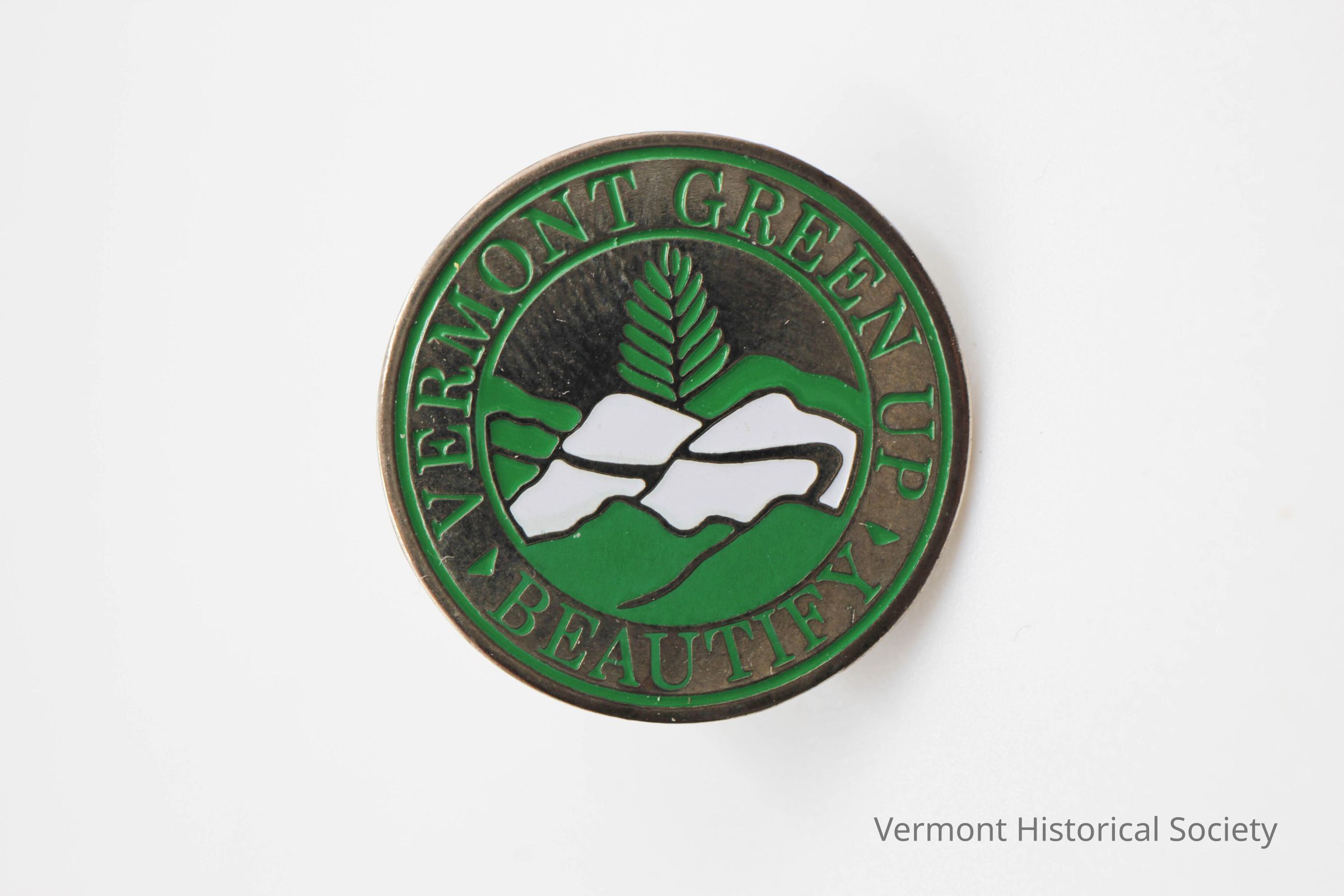 Round metal pin with green and white enamel. The silver metal pin shows two white mountains in the center surrounded by green mountains and a large green tree. The edge is ringed with the inscription, "VERMONT GREEN UP / BEAUTIFY".Context
