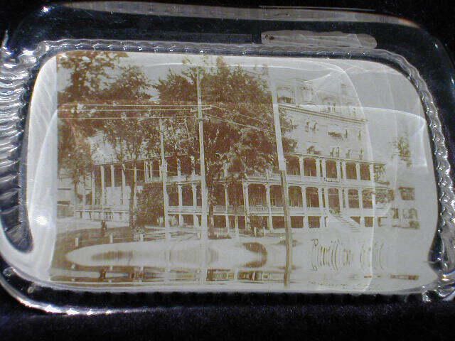 Rectangular, glass paperweight with a brown-and-white photography of the Pavilion Hotel pasted to the bottom.