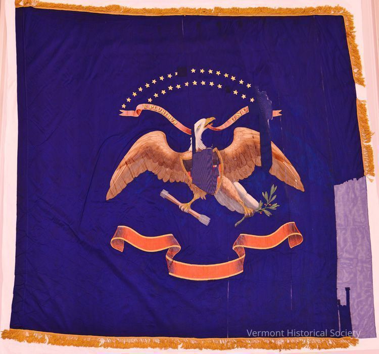 4th Vermont Infantry regimental flag (national issue). Attached to staff by sleeve. Fringe present. There are 35 gold painted stars arranged in two curved rows above the eagle.