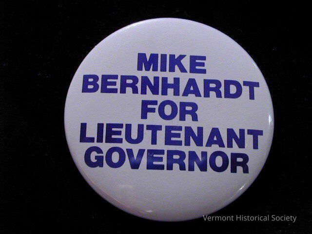White political button with the blue words, "Mike Bernhardt for lieutenant governor."