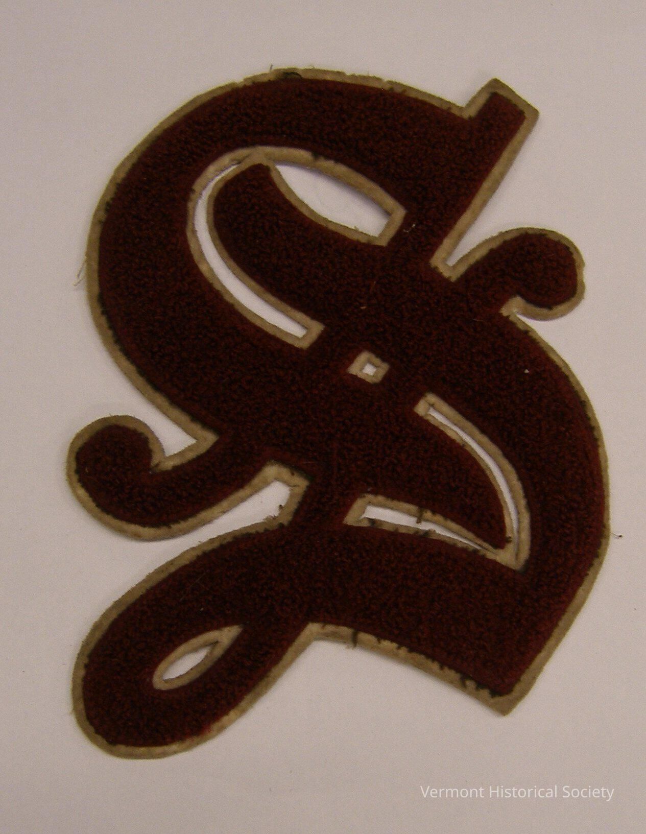 Varsity letter in the shape of an S in gothic script. The patch is made from looped pile wool mounted onto white felt. The reverse is lined with plain-woven white cotton.