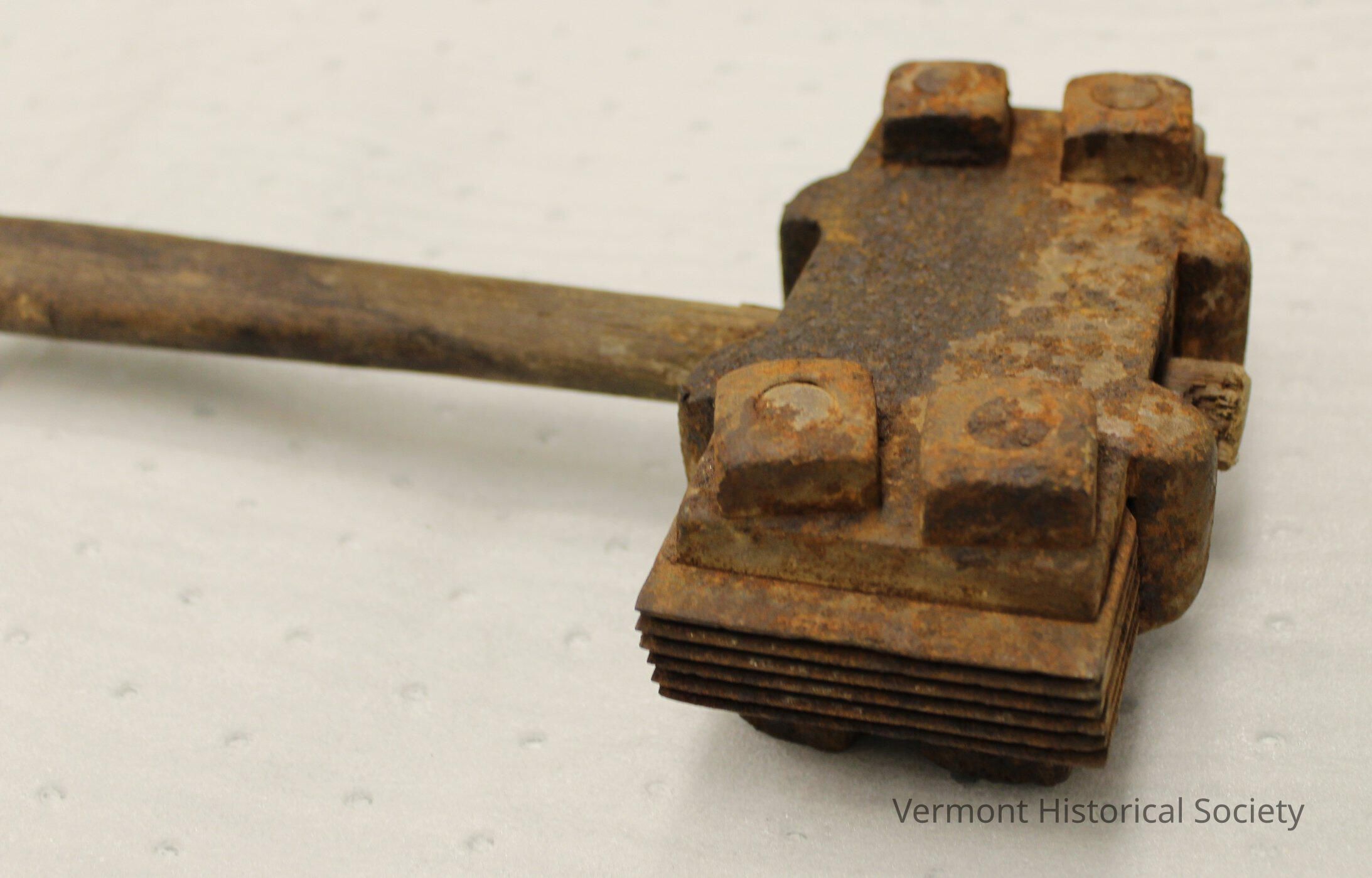 Iron and wood bush hammer. The worn wooden handle passes through the metal square face toothed head. Four square nuts and bolts are fastened on either end of the head.