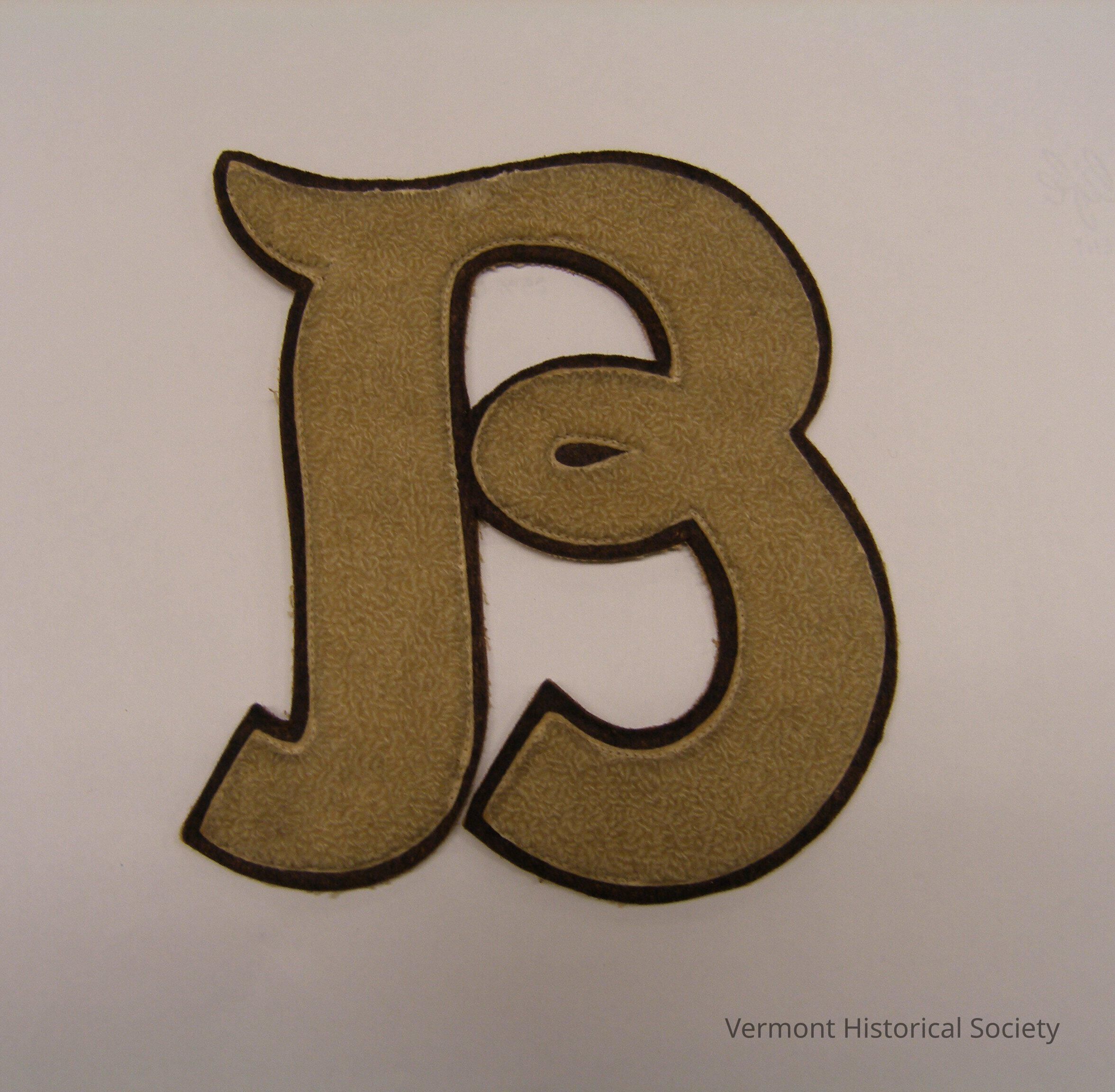 Varsity letter in the shape of a B. The patch is made from white or ivory looped pile wool mounted on dark maroon or black felt. The reverse is lined with twill-woven cotton.