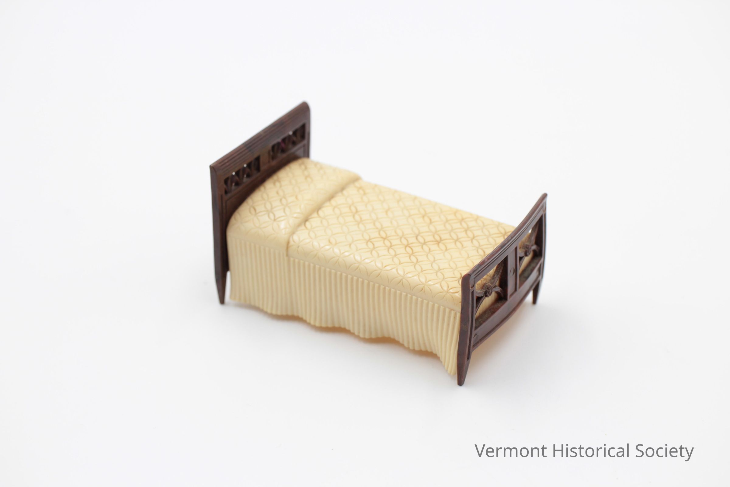 Miniature plastic bed sized for a dollhouse. The bed has a foot and head molded from marbleized brown plastic in an open-carved design. The bed surface is molded to look like it's covered with a cream-colored quilt, rolled over a pillow at the head.Context