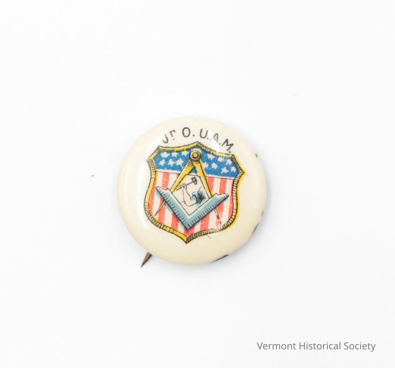 Small round metal button printed with a shield of the United States flag with an icon of an arm raising a hammer in between a compass and a carpentry square. The initials, "Jr. O. U. A. M." are at the top.