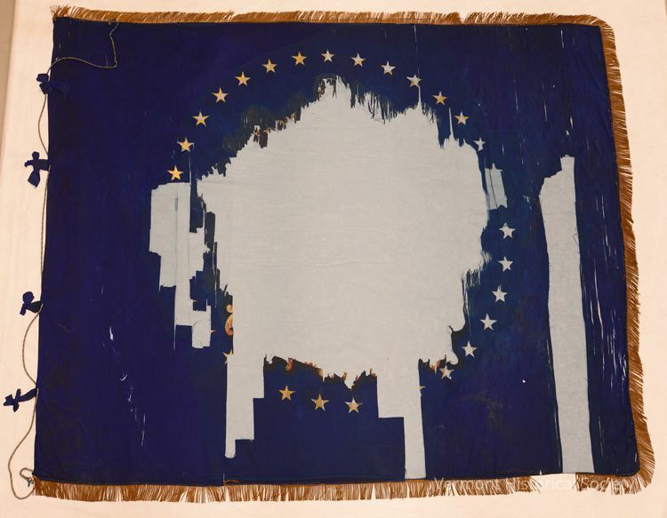 7th Vermont Infantry regimental flag. Blue background. Gold fringe. Large void at center (state coat of arms missing).