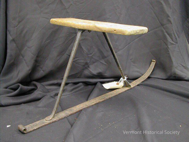Jackjumper consisting of a metal blade, or ski, that is curled at the ends beneath a wooden seat held by 2 metal rods in a V shape.