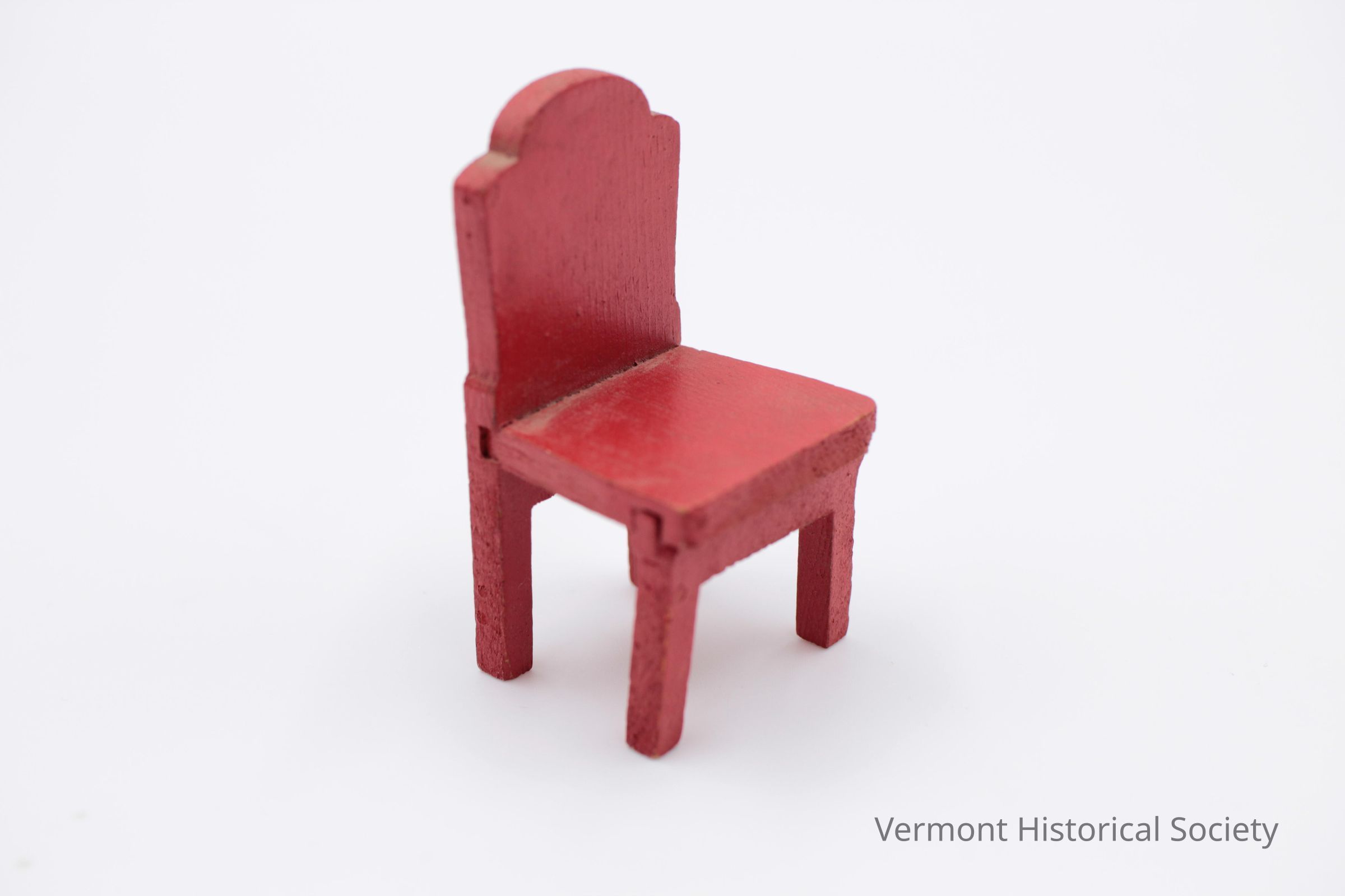 Red wooden dollhouse chair. The chair is made of three pieces: the backrest and back legs, the seat, and the front legs. The top of the backrest is carved with a raised semicircle. One of a set of four.Context