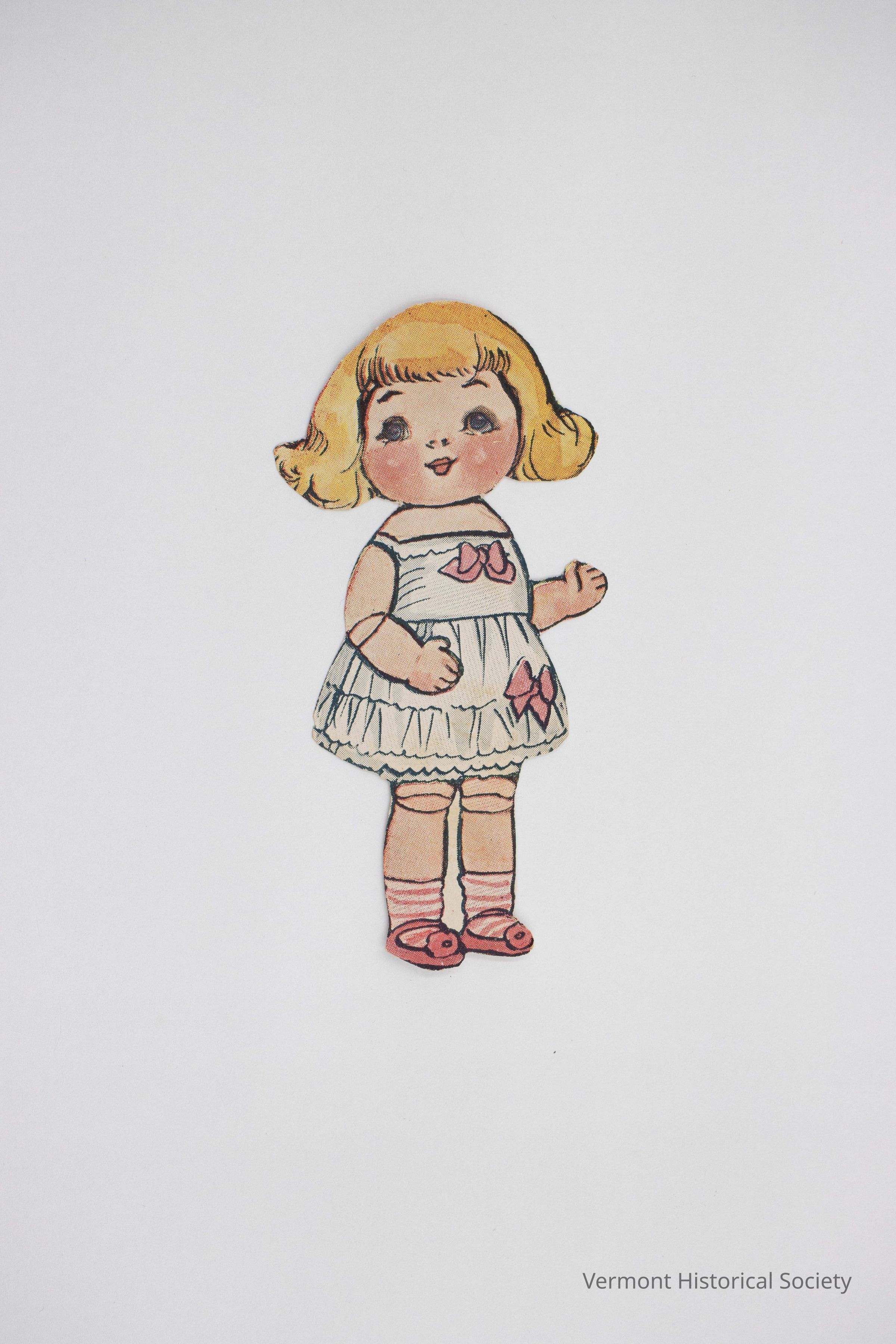 Small paper doll. The doll depicts a young child with yellow hair and pink skin wearing a white dress undergarment and pink socks and shoes.Context