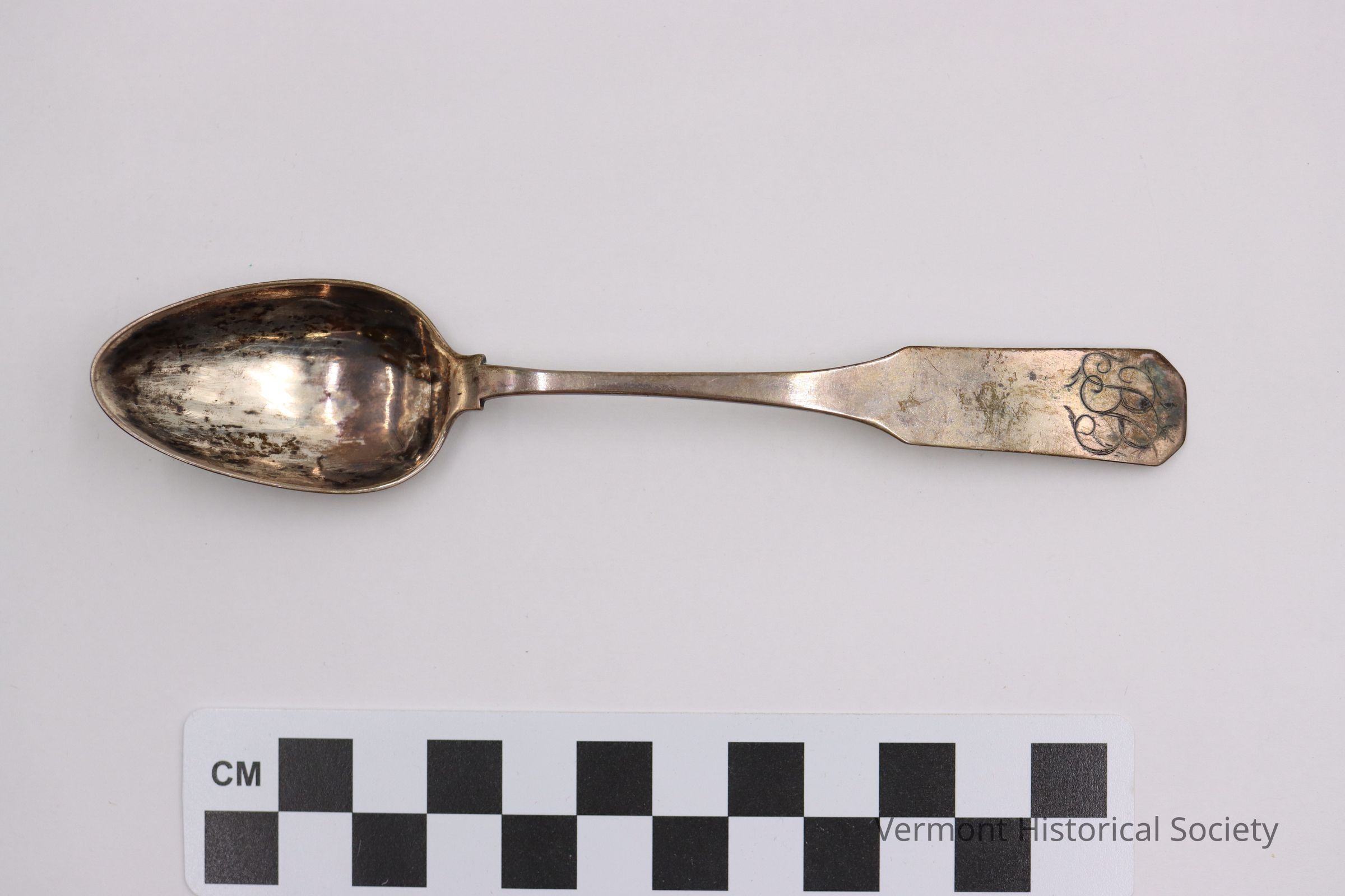 One of a pair of teaspoons with coffin-shaped handles engraved with the initials "BB".