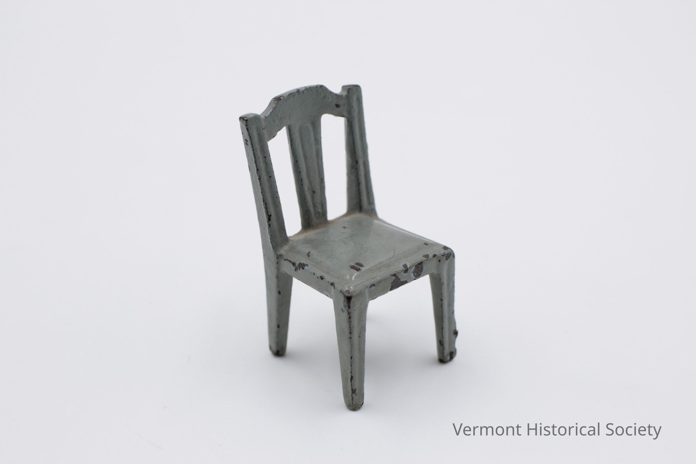 Miniature side chair sized for a dollhouse. The chair is made from cast iron and painted light blue.Context