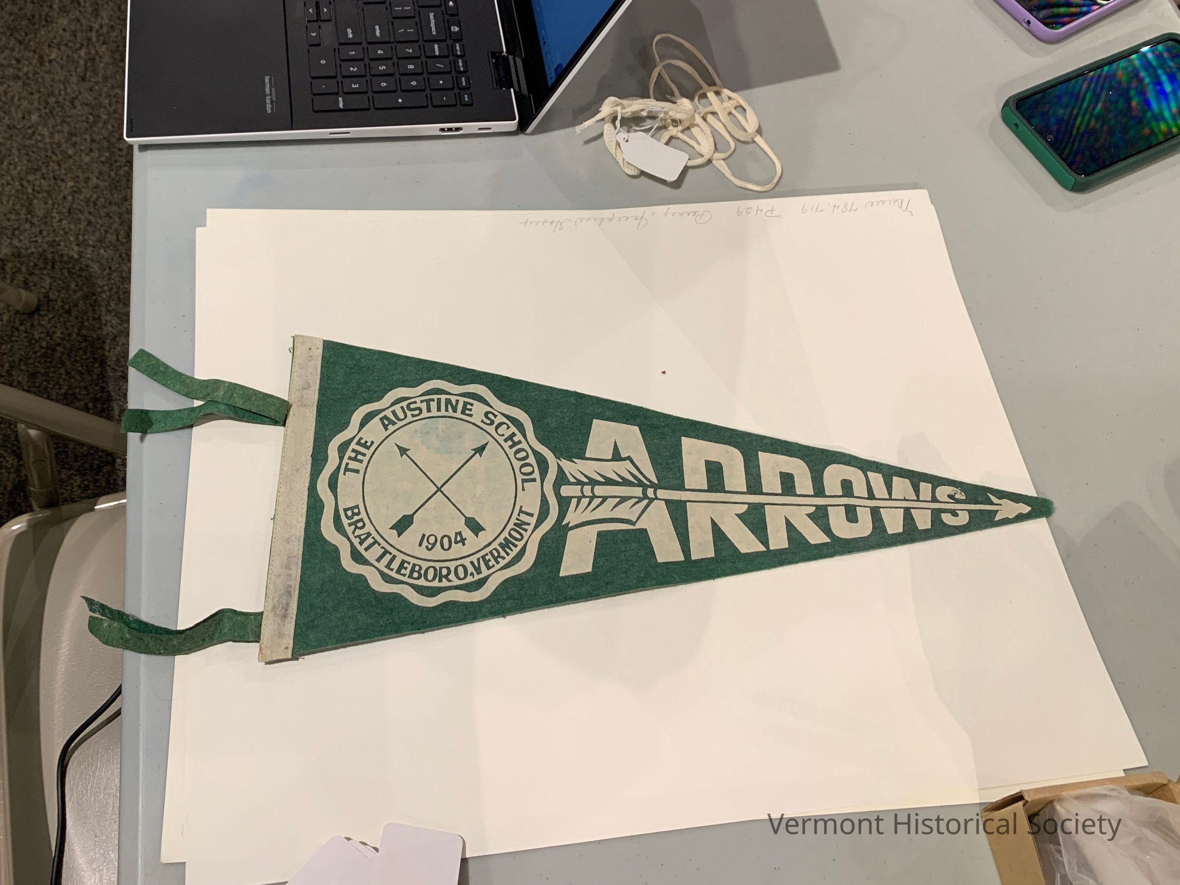 Green felt pennant depicting "ARROWS" inscribed behind an arrow coming from the circular school crest inscribed with "THE AUSTINE SCHOOL BRATTLEBORO, VERMONT 1904" with crossing arrows in the center. Two green straps protruding from left side to secure.
