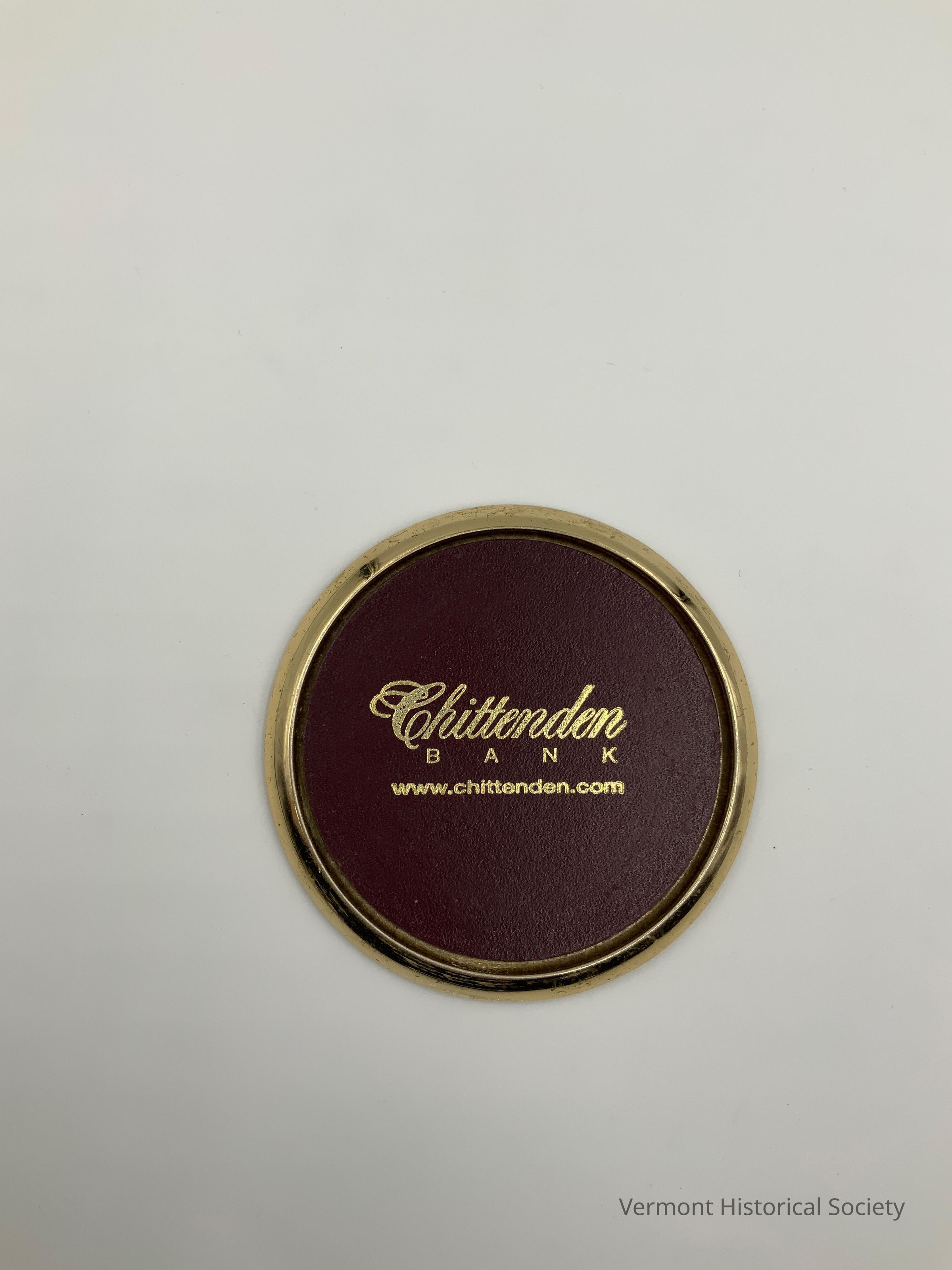 Plastic and faux leather coaster. The coast has a raised ring around the edge. The center is faced with burgundy faux leather printed with the label, "Chittenden BANK / www.chittenden.com".