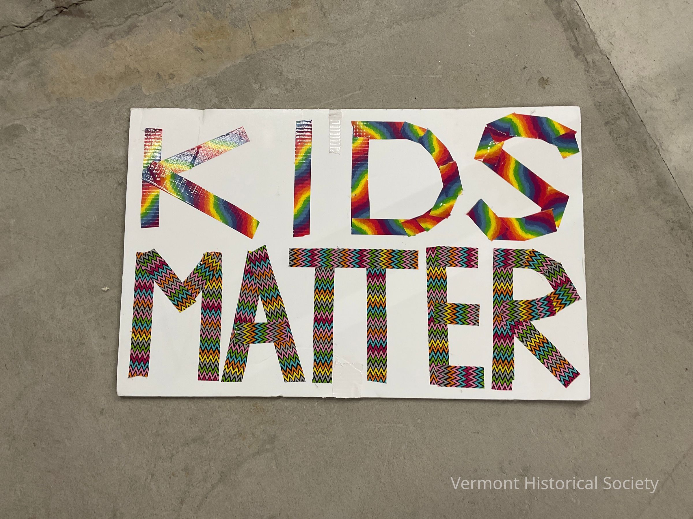 A white, single-sided protest sign with the words, "KIDS MATTER" formed by multi colored tape.