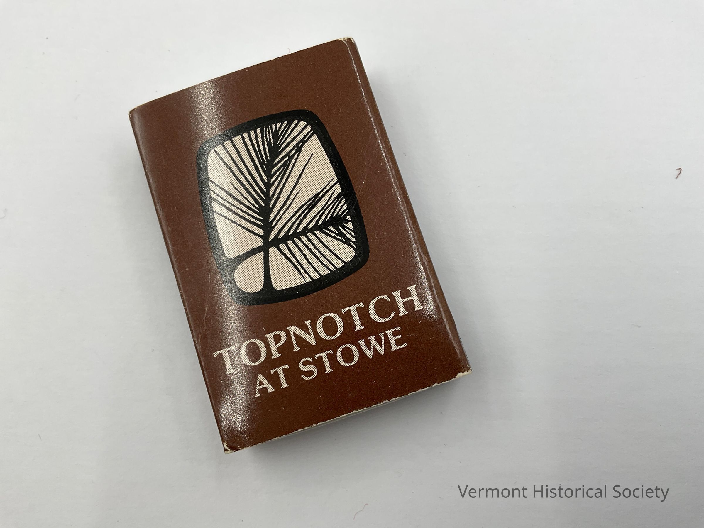 A brown box of white-tipped, wooden matches advertising Topnotch at Stowe, a resort and spa. The name of the resort is printed in white below the image of a pine branch in black. On the back is the message, "Vermont's world-class resort," Topnotch at Stowe, Mountain Rd, Stowe, Vermont, 802/253-8585. This box has strike strips on both sides. Below one is the manufacturing information: Pocketbox, Diamond Match Div, Springfield, Mass.Context