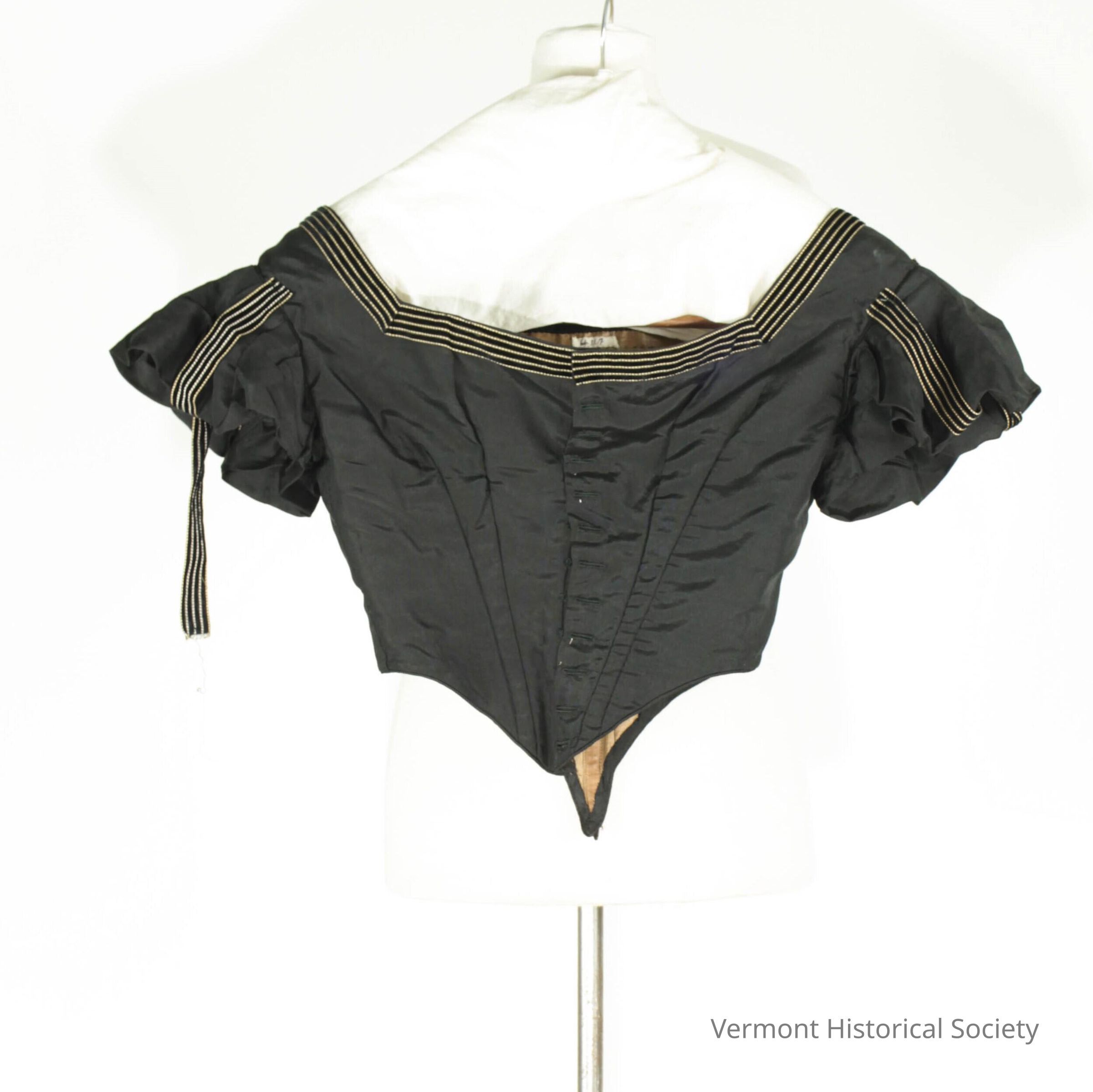 Black silk bodice trimmed in black-and-white striped ribbon. The waistline is point in both the front and back, and the bodice is shaped with darts that are stiffened with boning. The sleeves are turned under, created a puffed effect. It is lined in brown cotton.Context