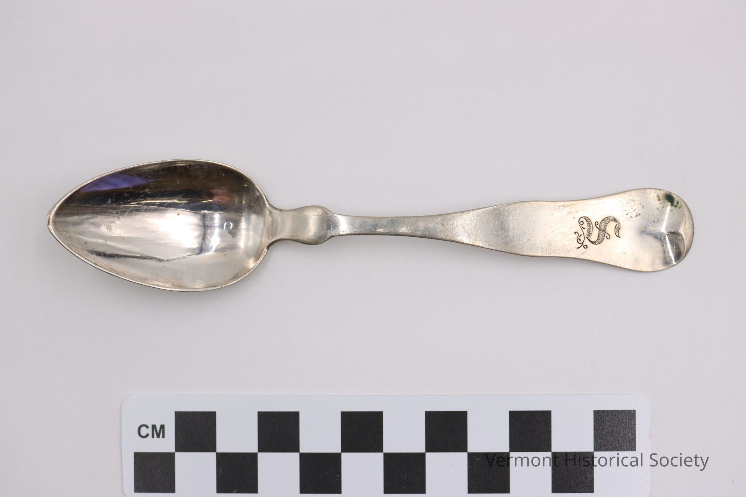 Silver teaspoon with rounded shoulder. The handle is engraved with the letter S in gothic script. The back of the handle is marked, "A. A. MEAD".