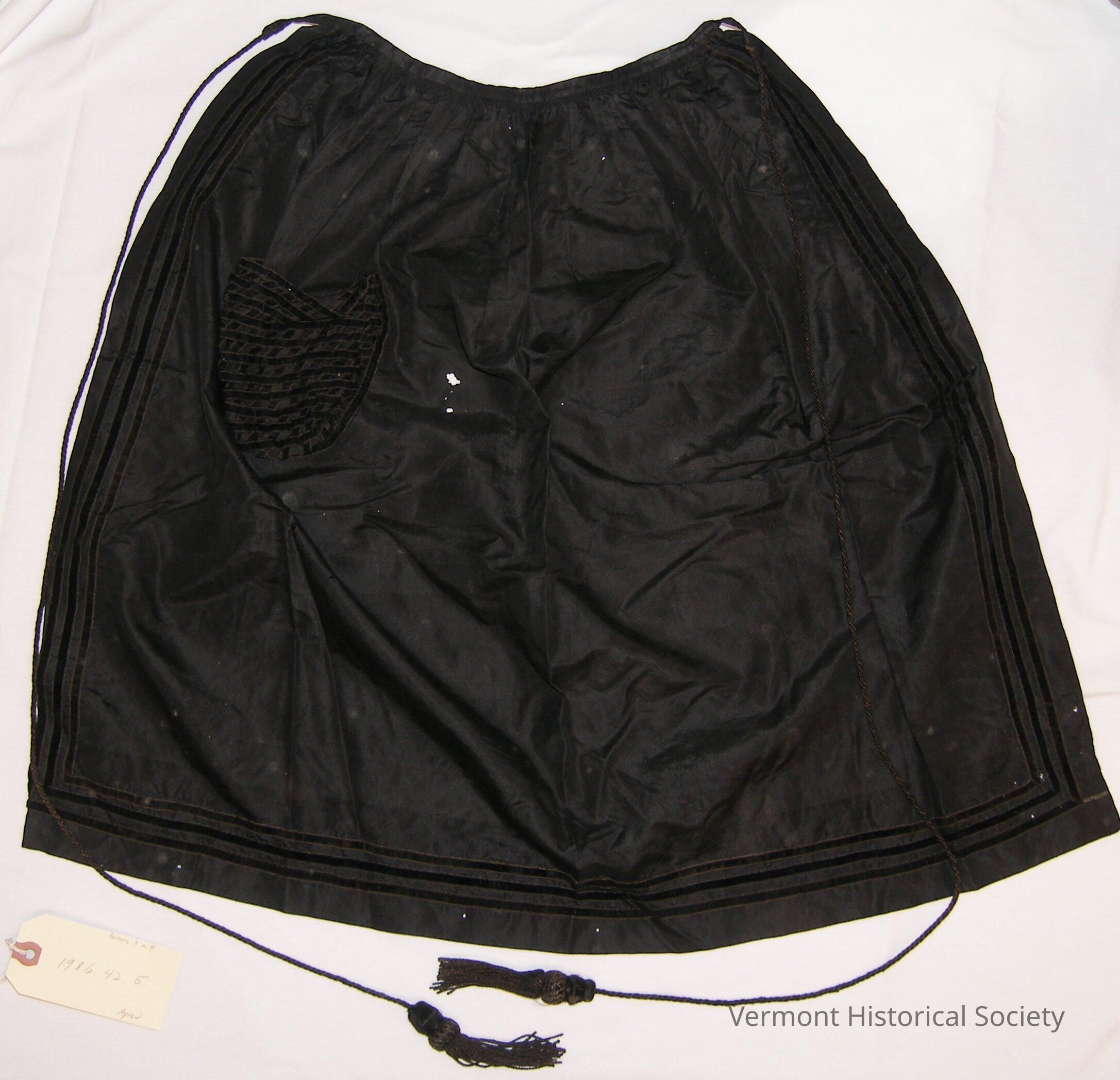Black silk apron with a patch pocket. The apron is gather to a narrow waistband that extends out to a tie. The edges are trimmed with 3 rows of velvet ribbon, and the pocket is decorated with velvet ribbon in both horizontal and vertical lines, making a lattice. There is a tassel on each end of the waist tie.Context