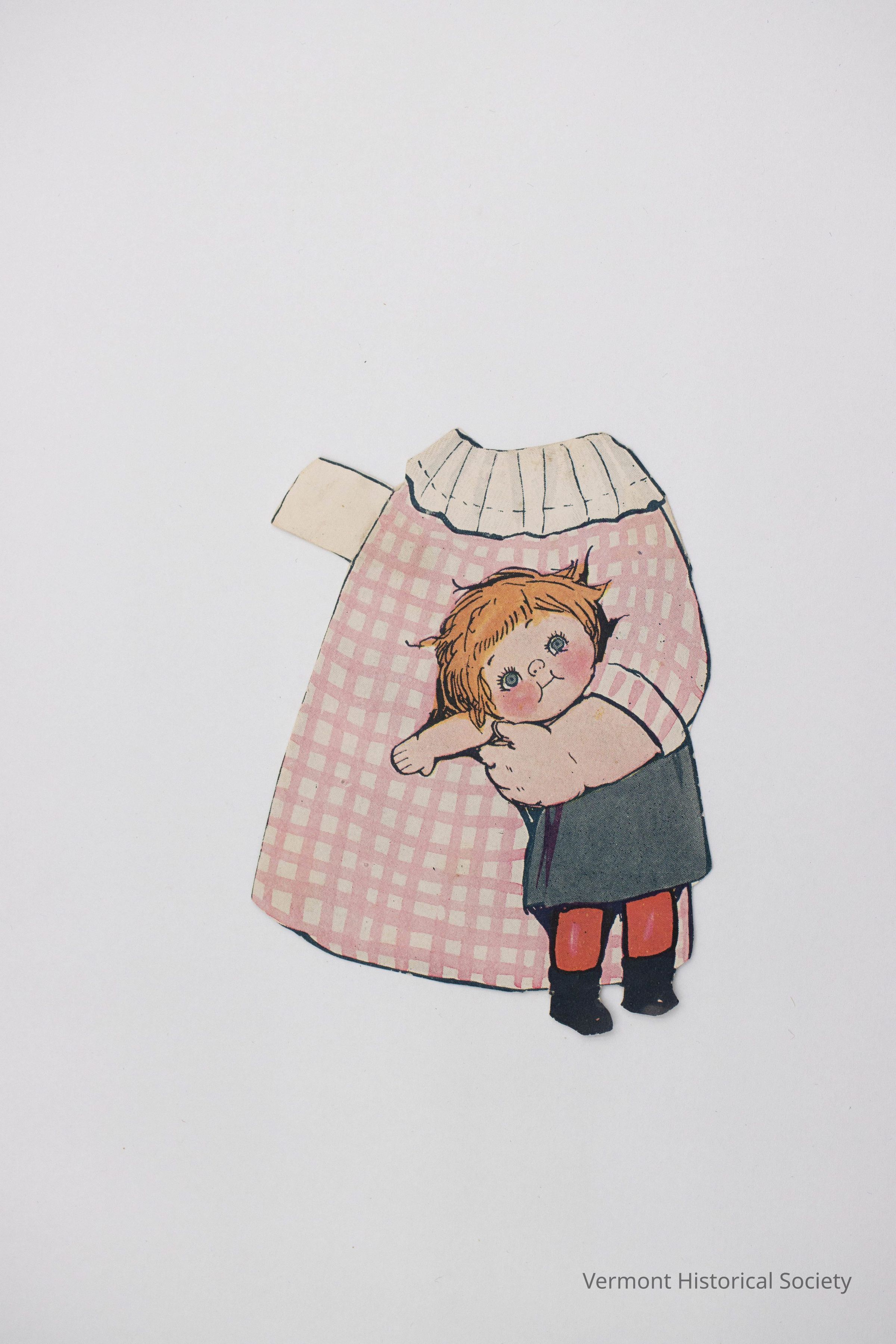 Printed paper dress for a paper doll. The dress is pink check with a white collar. One hand is holding a doll. The back shows a portion of a magazine article.Context