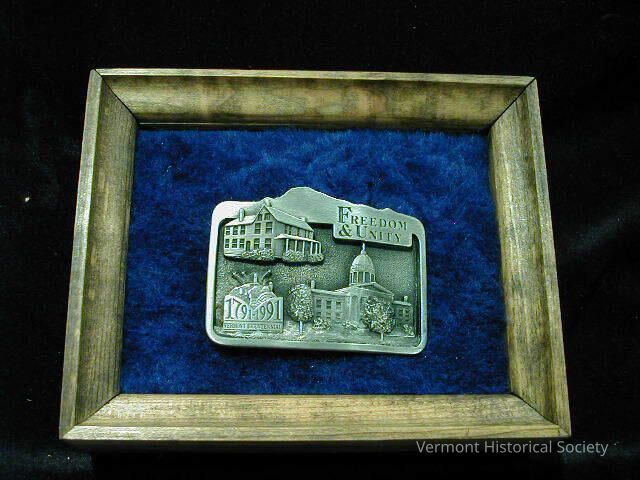 Pewter belt buckle with 4 designs and a mountain profile along the top edge. The top left corner has the Constitution House in Windsor, bottom left is the logo of the Vt. Bicentennial, the top right has the words "Freedom and Unity", and the bottom right shows the Statehouse. The reverse is marked with the manufacturer's copyright, their strike, a proof mark of 2500 buckles (1991 Limited Edition), a statement concerning the design, a licensing statement, and the number 900382. The buckle is mounted inside a deep frame on plush, blue fabric.Context