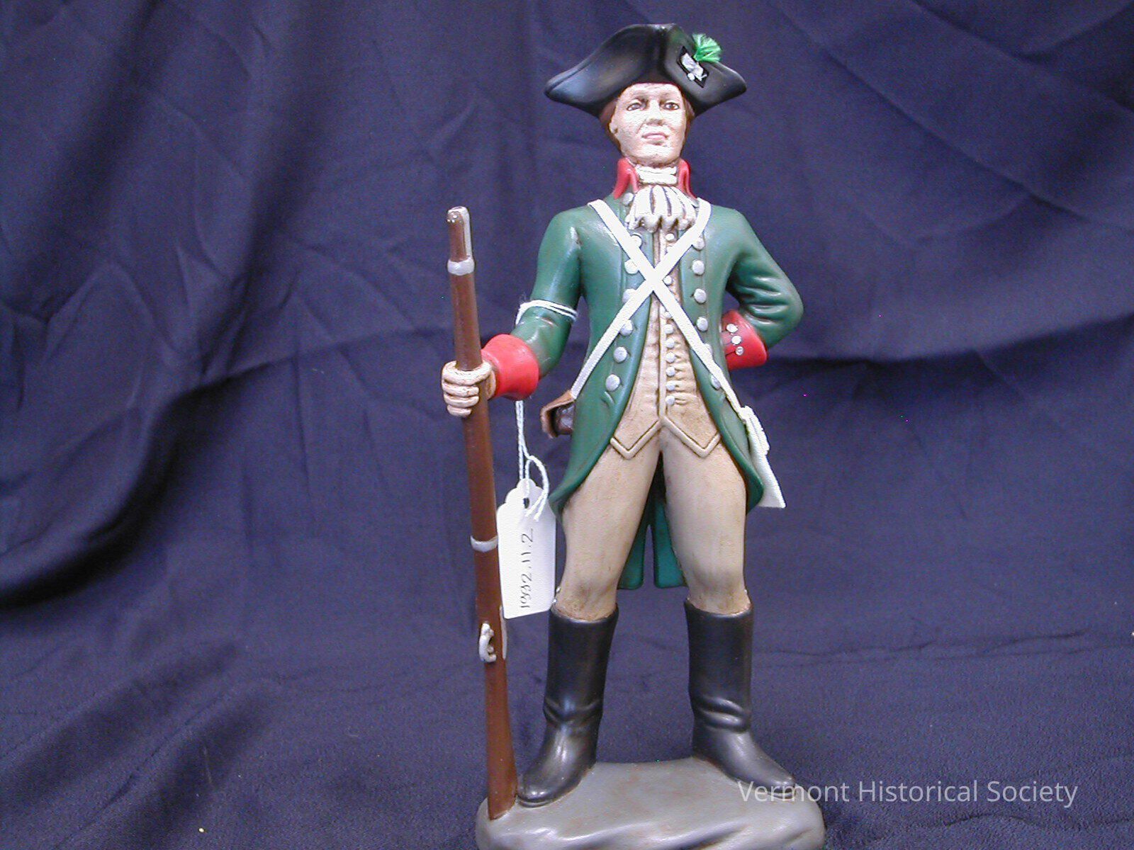 Hollow ceramic figurine of a soldier wearing 18th-century style clothing, including a tricorn hat, green coat with red cuffs and collar, black boots, a white cravat, and tan waistcoat and breeches. He is shown standing at ease with one hand holding a musket with the butt on the ground. The figurine is labeled, "Colonel Seth Warner's Special/Regiment of Green Mtn. Boys,/Formed in June, 1775/No. 1 of 250/ Limited Edition/1771-1991."Context