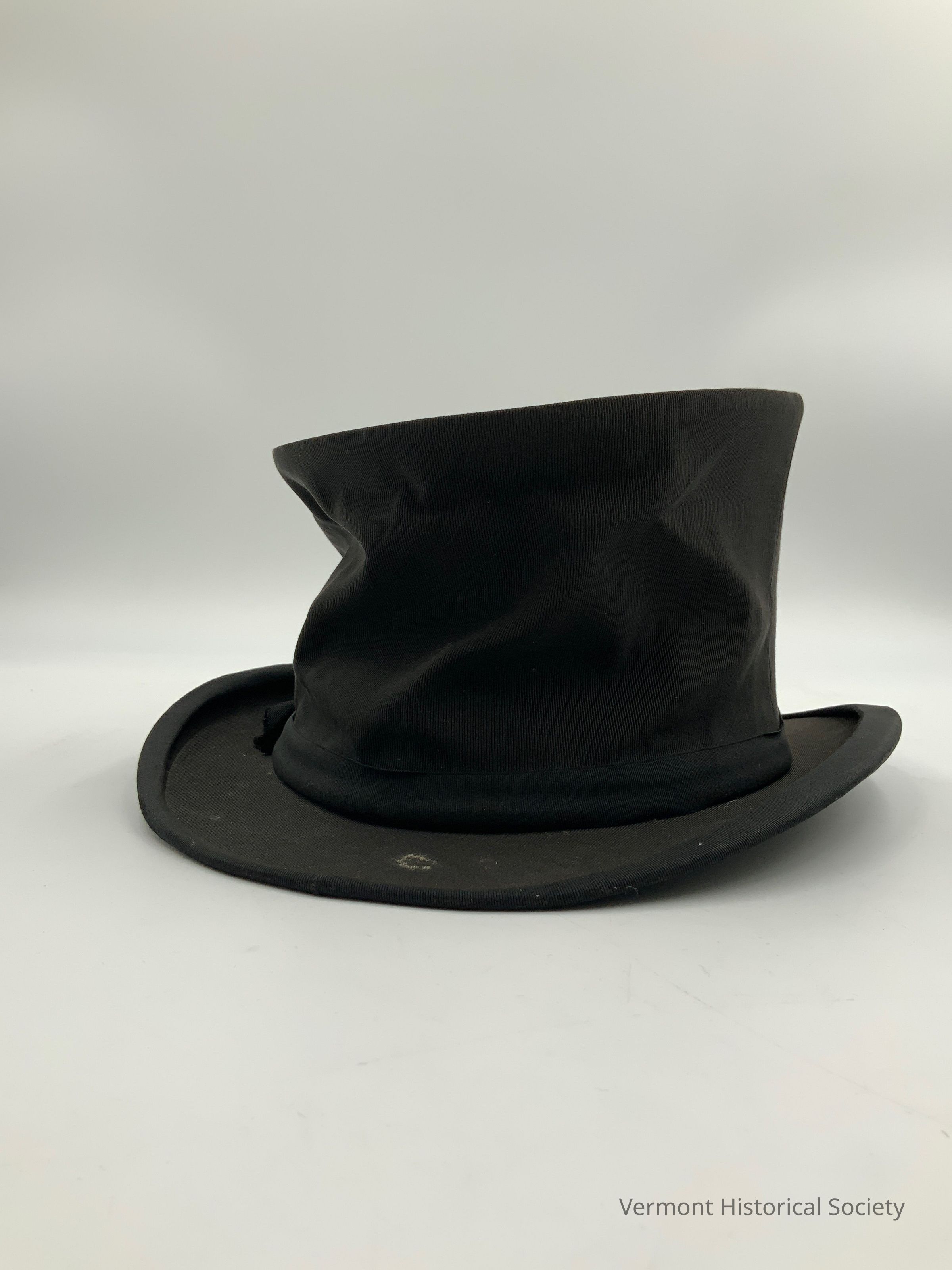 Black faille collapsible top hat. The interior lining is marked with the label, "Mallory, New York". One of the collapsible supports is broken.Context