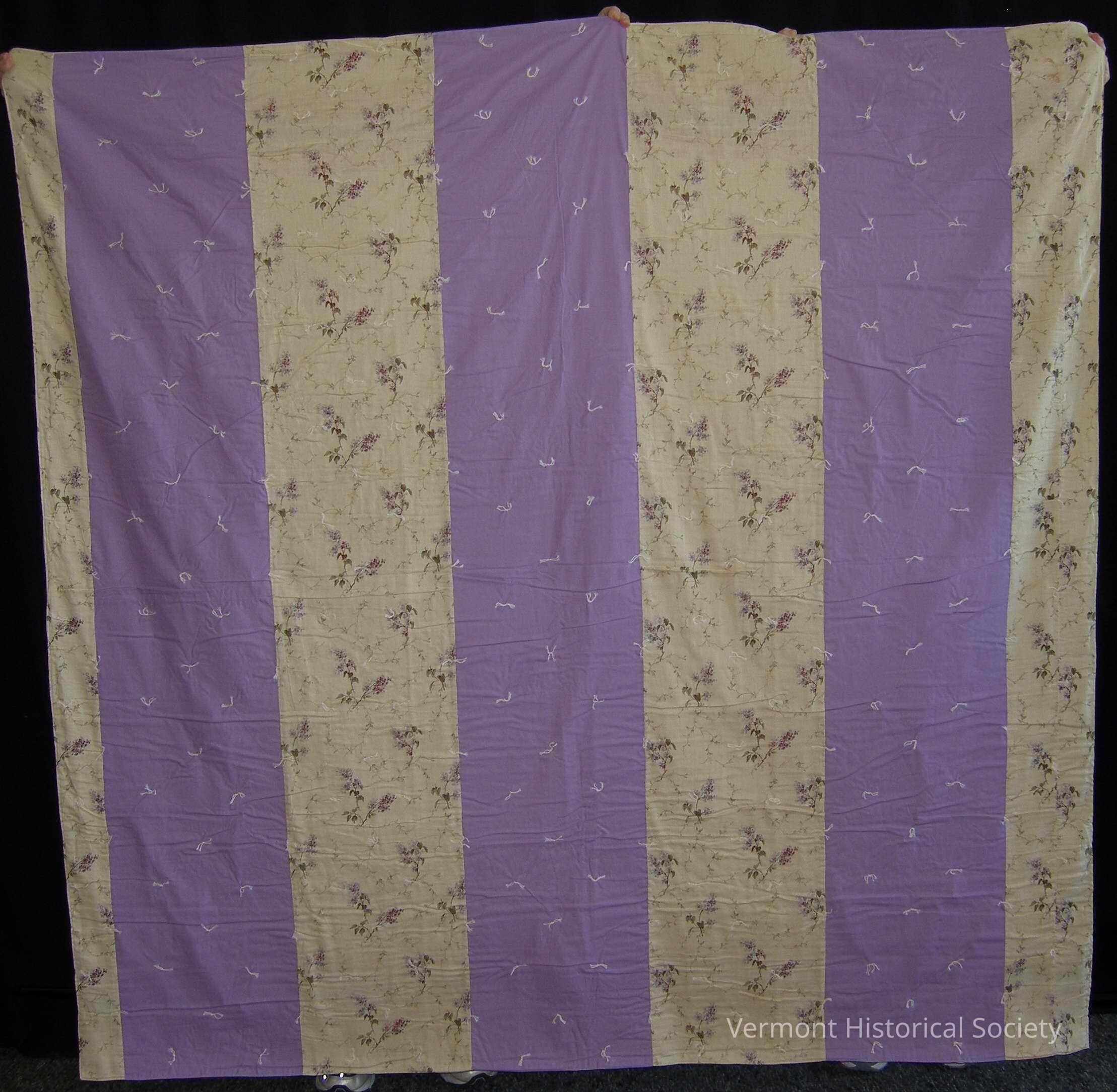 Tied quilt pieced of fabric strips stretching the full length of the quilt. The strips alternate between a white cotton printed with lilacs, and a light purple cotton. The reverse is back entirely in the lilac-printed cotton. Rather than quilted, the piece is tied with white yarn. The pieces is all machine stitched.Context