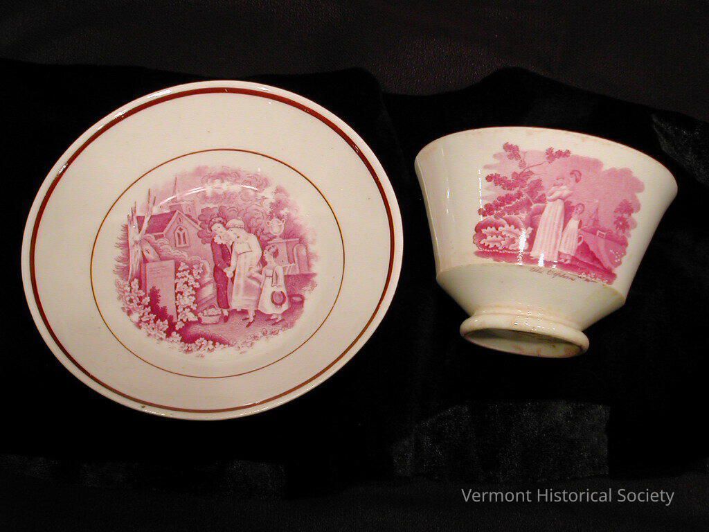 White ceramic saucer with raised, bowl-like rim. The center of the saucer is transfer printed in pink with a scene showing three young children holding hands while standing in front of a headstone. There is a small basket of flowers in front of the children and a man’s top hat overturned on the ground behind the children. There is a chapel in the background and flowers around the edges. The bottom of the illustration is labeled “The Mother's Grave.“