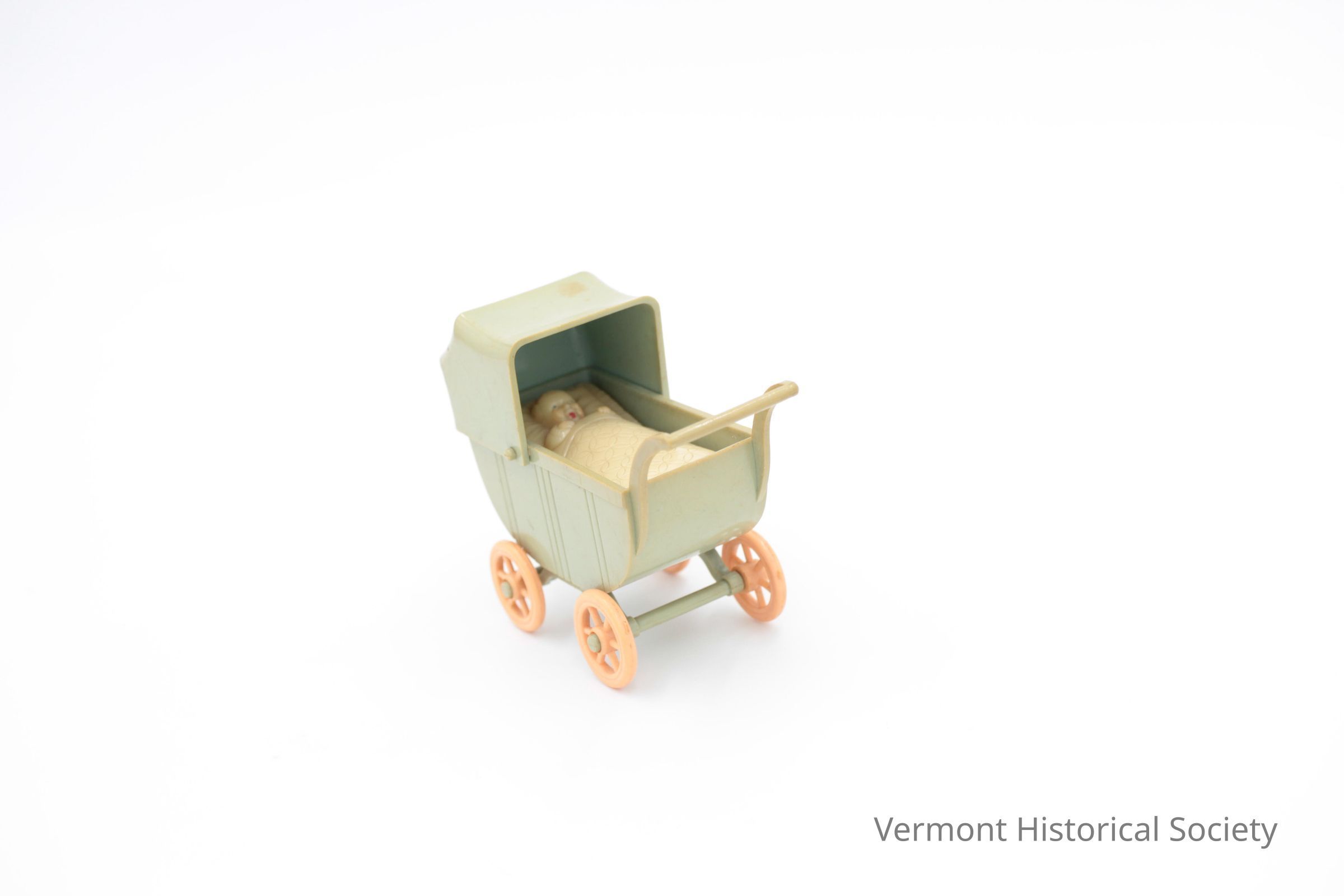Miniature plastic baby carriage sized for use in a dollhouse. The carriage is made of blue plastic with pink plastic wheels. The body of the carriage is round on the bottom with a push handle on one end and a curved shade on the other. The shade is hinged to be able to swivel to either side of the top. There is a rectangular, white plastic insert inside the carriage molded to show a baby tucked beneath a blanket with a pillow under its head. The insert can be removed from the carriage.Context
