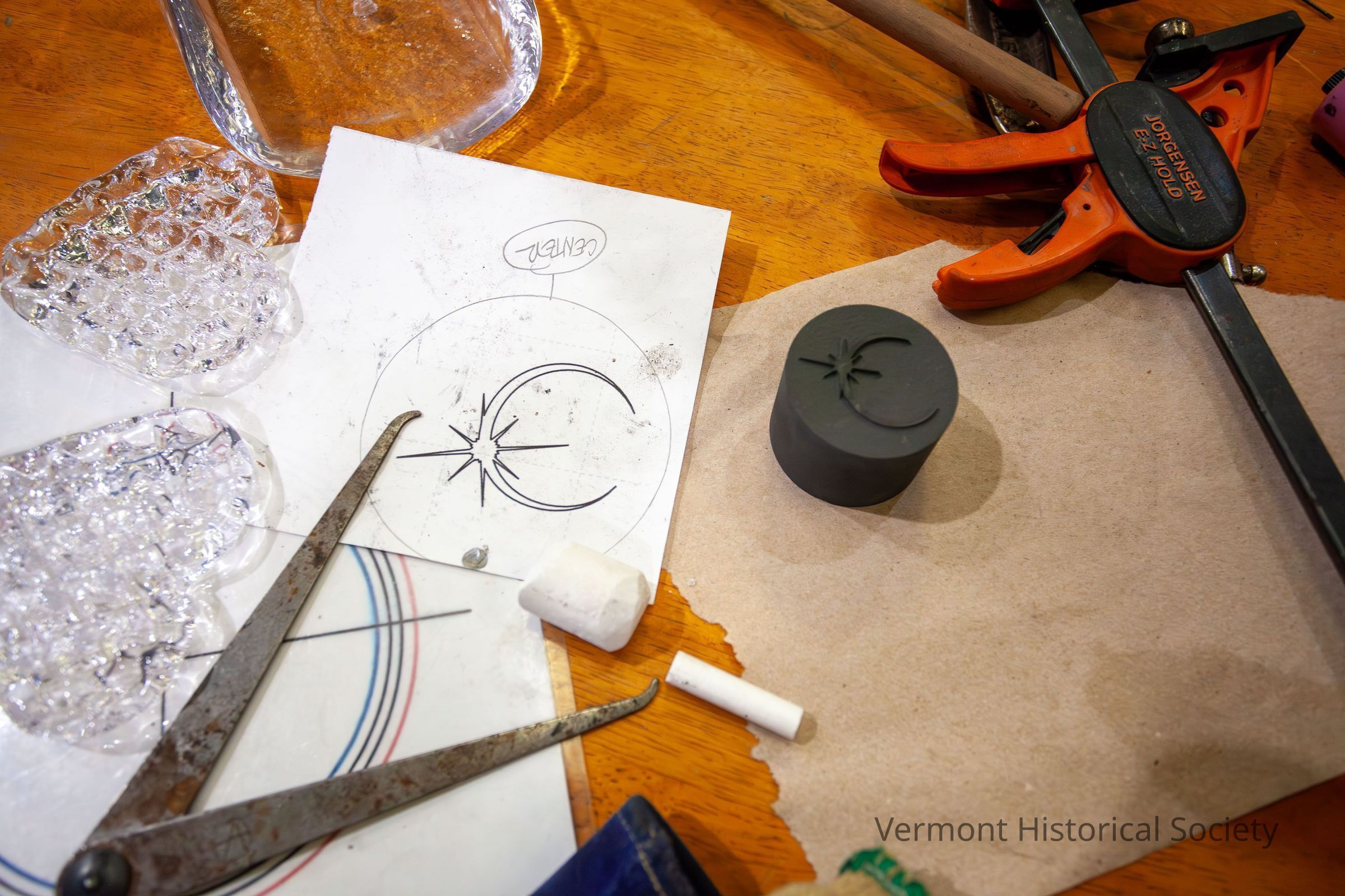 Graphite stamp designed by Justin Harris at AO Glass to create custom suncatchers for the 2024 total eclipse in Vermont. The graphite cylinder is smooth on the sides and top and bottom surfaces, with a laser-cut design of the "diamond" moment just before totality. The underside of the stamp has a circle of stars around the edge that were part of an old, discarded design.Context