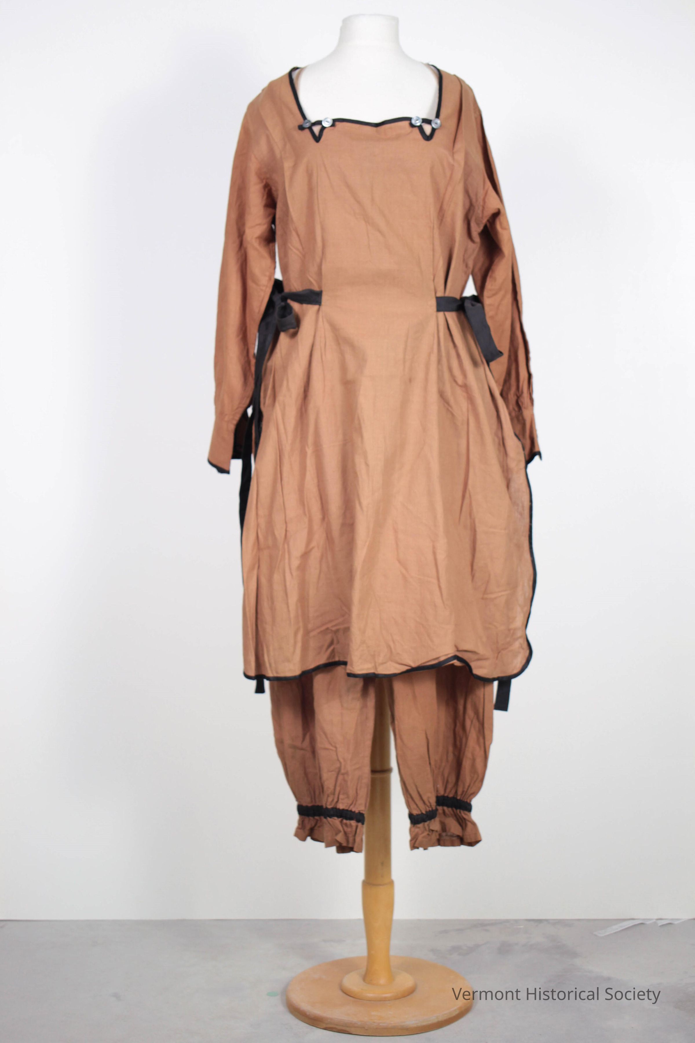 Gym uniform consisting of a tunic top and bloomer-style pants, both made of tan cotton edged in black cotton tape. The tunic has long sleeves and reached to below the wearer's knees. The neckline is square and accented at the corners with triangular cutouts, each with mother-of-pearl buttons at the top corners. The tunic is cut straight, but the waist can be fitted with black cotton ties on either side.