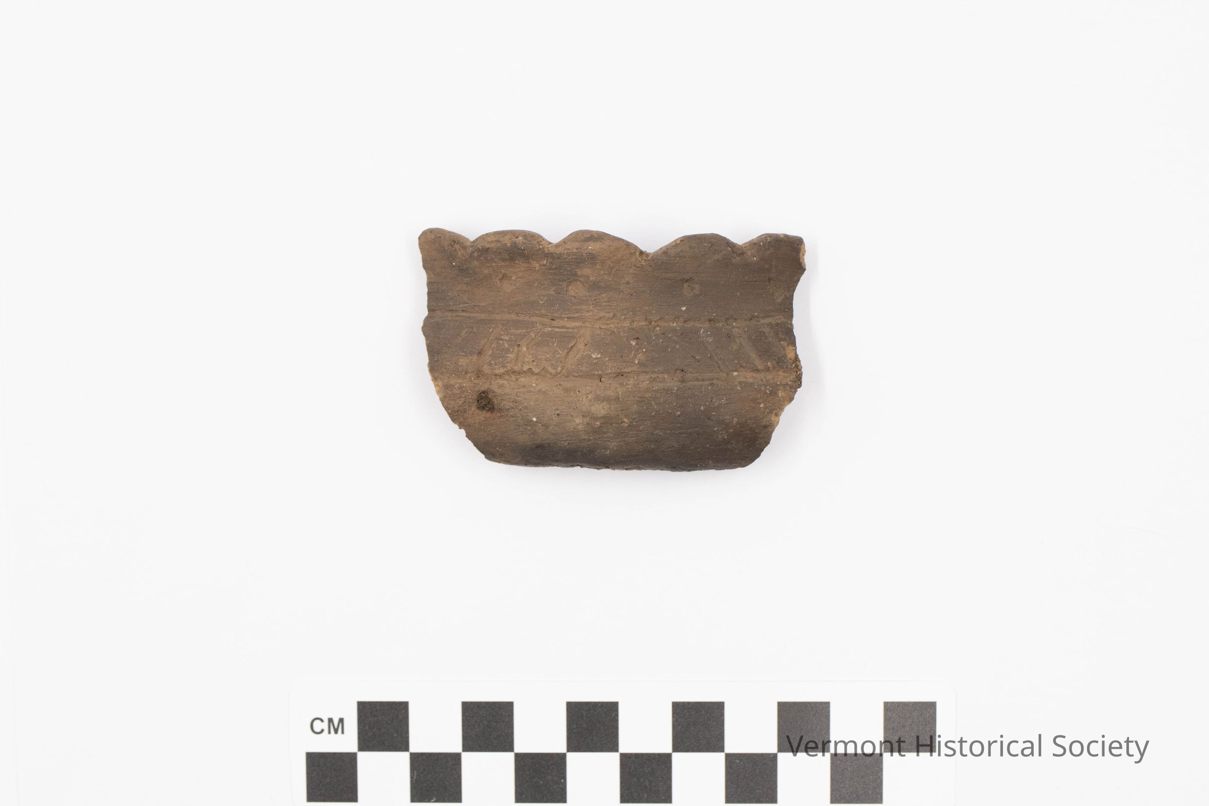 Rim sherd with a scalloped lip and shallow punctations below scallop. There are 2 parallel, horizontal incised lines with oblique incised lines inside them.