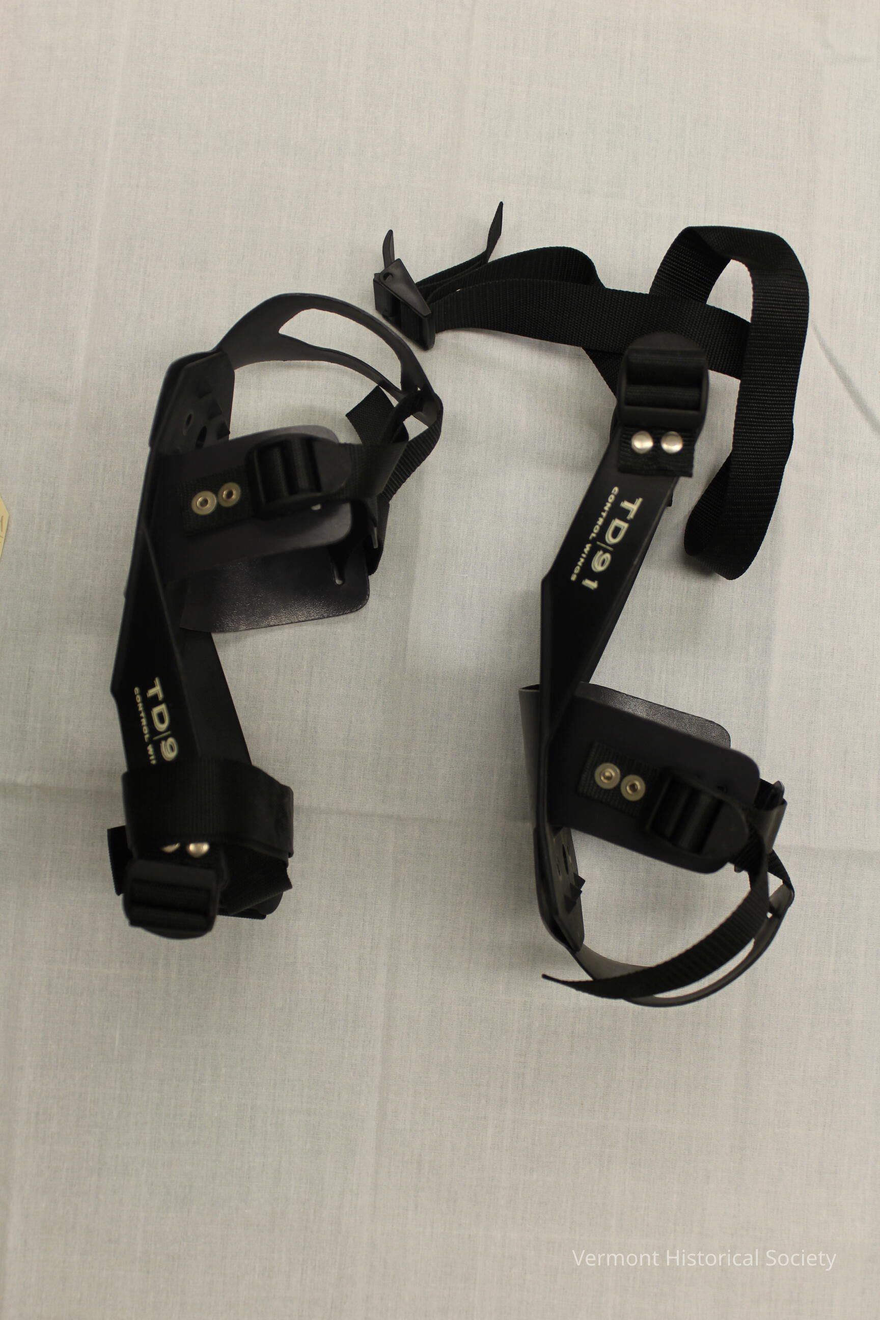 Pair of snowshoe bindings consisting of a shaped plastic base and cotton webbing straps. The base is shaped with vertical extensions on both sides and a tab that curls over the toe. There are two straps, both of which are adjustable with plastic clasps. One strap strings through the toe tab and connects to the front side extensions. The other strap connects to the back side extensions and is much longer than the front strap. The base is labeled, "TUBBS" and "TD|91".Context
