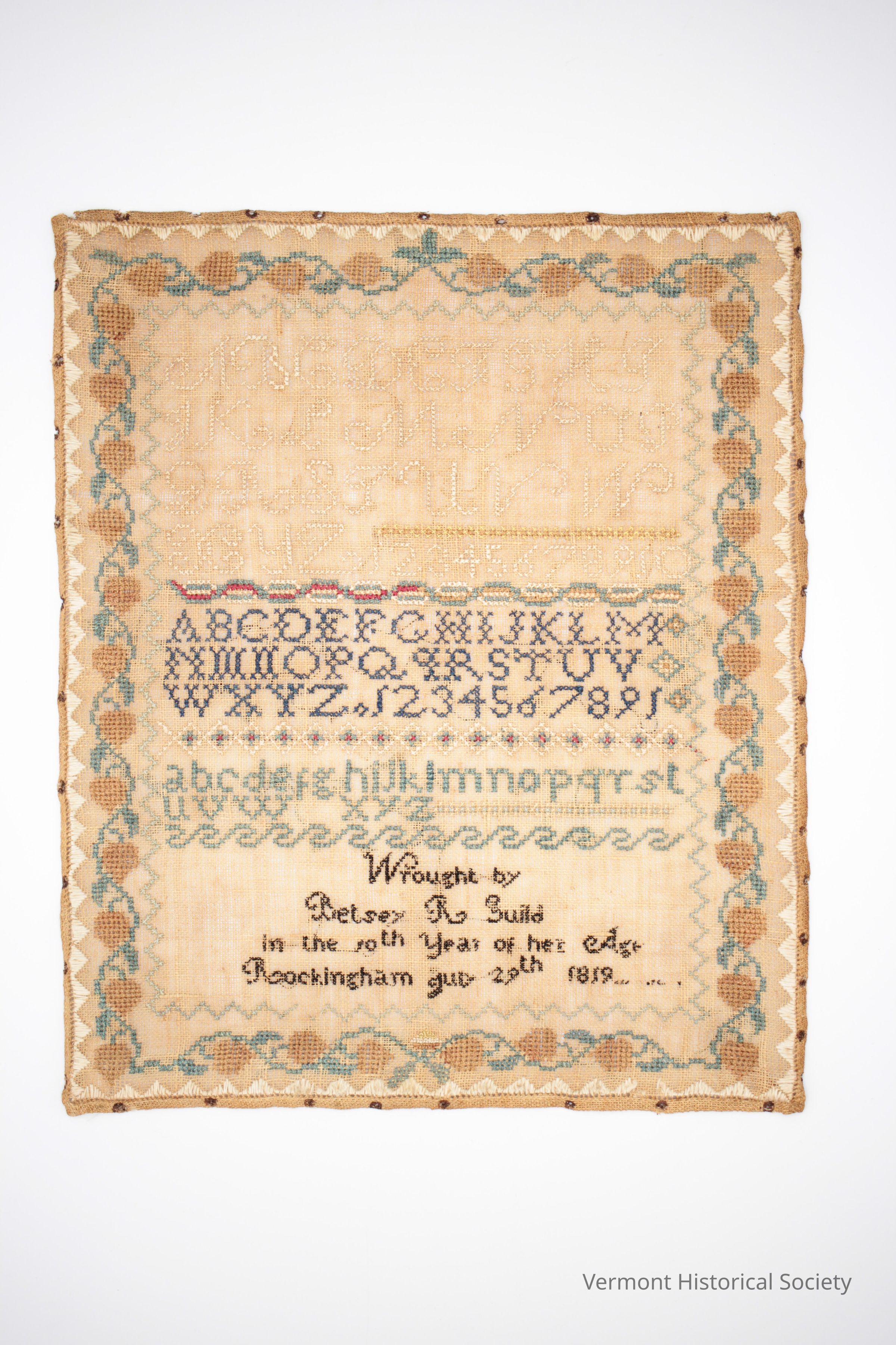Text on linen (might be homespun) sampler begins at the top with a cursive, upper case alphabet in cream followed by the numbers 1-10. A red, white and blue border followed by an upper case, blue block alphabet. Another red, white and blue border (diamond) followed by a pale blue, lower case alphabet and a wave-like pale blue border. At the bottom "Wrought by/Betsey R Guild/in the 10th Year of her Age/Rockingham July 29th 1819xxxxxxxxx" The perimeter includes three borders. On the outside is a cream triangle design, center has a brown and blue vine and floral, inside a pale blue zig-zag.Acquisition
