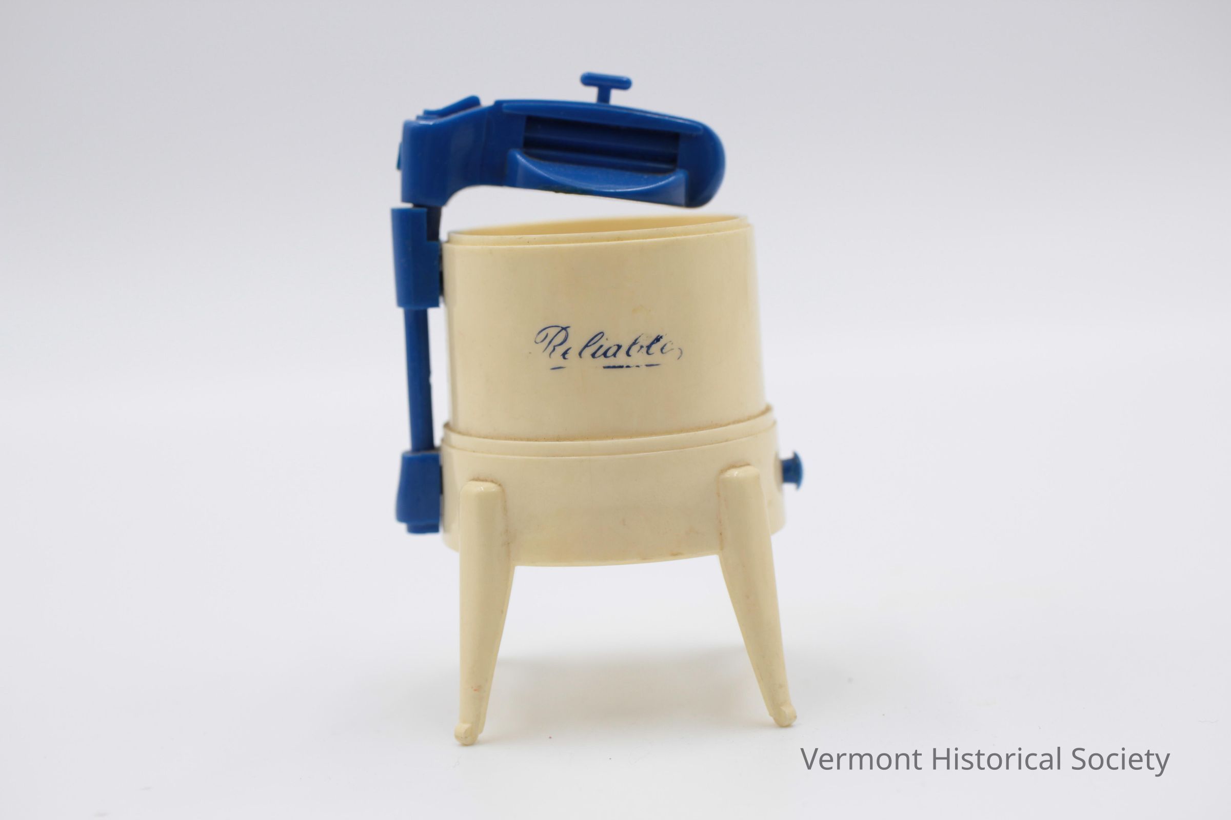 Miniature plastic washing machine sized for a dollhouse. It consists of a cream-colored plastic basin on four legs with a blue plastic mangler attached to the side and extending over the top. The side is labeled "Reliable".Context