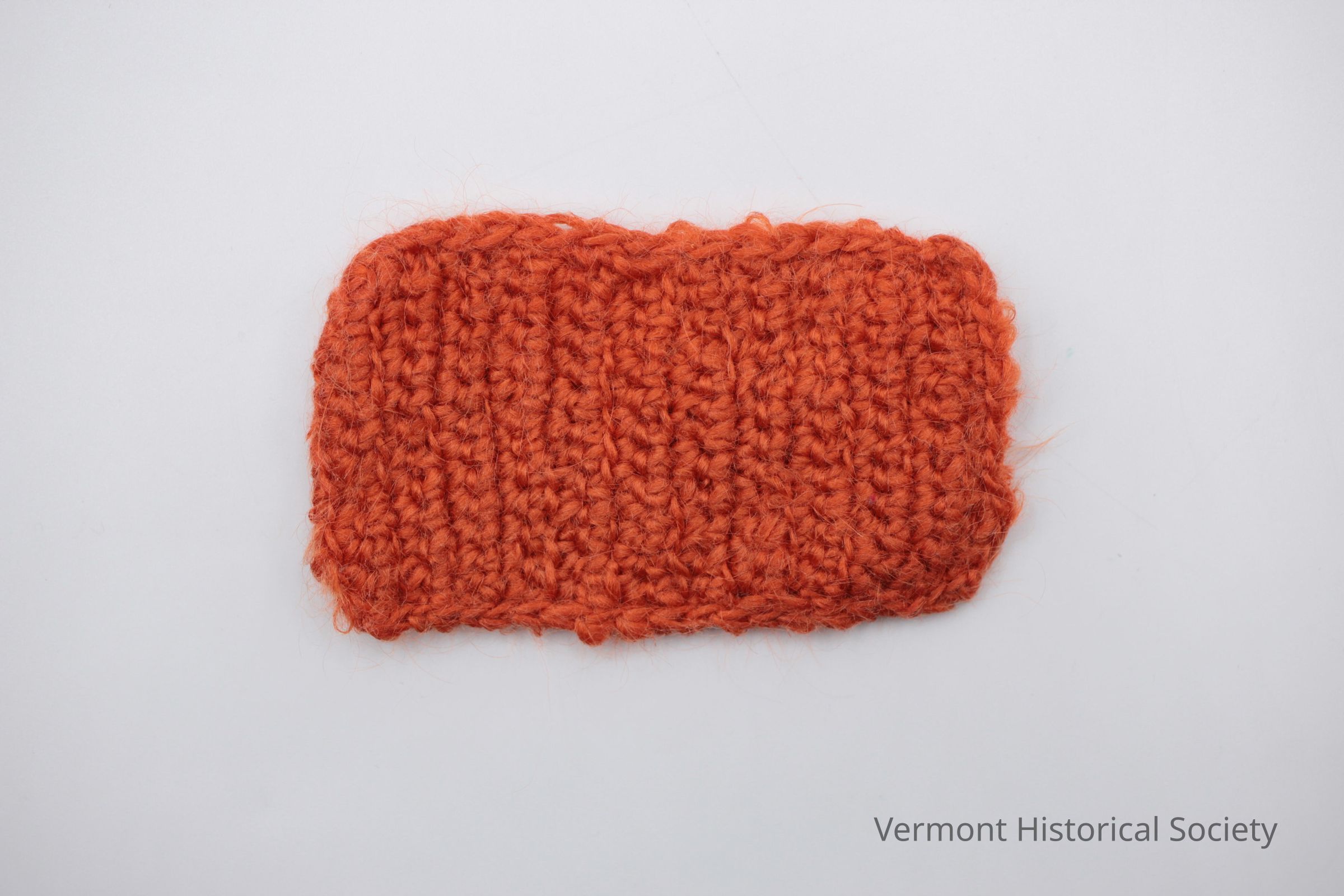 Miniature rug sized for a dollhouse. It is crocheted with orange finger-weight yarn.Context