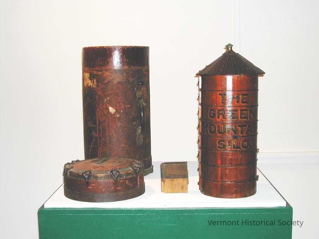 A salesman's model of a silo with its carrying case. The miniature silo is made of red stained wood with a wooden roof. The side of the model is painted with the label, "THE GREEN MOUNTAIN SILO". The inside of the model has a sticker with the inscription, "MANNING MANUFACTURING CO./MANUFACTURERS OF DAIRY & CREAMERY APPARATUS/RUTLAND, VERMONT". The roof comes off the model to show the inside and has a wedge-shaped opening secured with strap hinges. Each level up the side of the silo has a functioning, removable square door. The sample kit comes with two silo board samples. The leather carrying case is shaped to fit the model, with a tightly-fitted removable lid, and a carrying handle on the side.Use