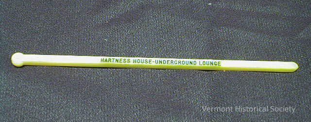 Yellow plastic swizzle stick with the inscription, "HARTNESS HOUSE - UNDERGROUND LOUNGE". There is a ball at one end.